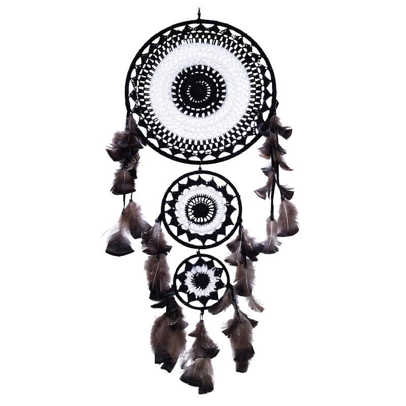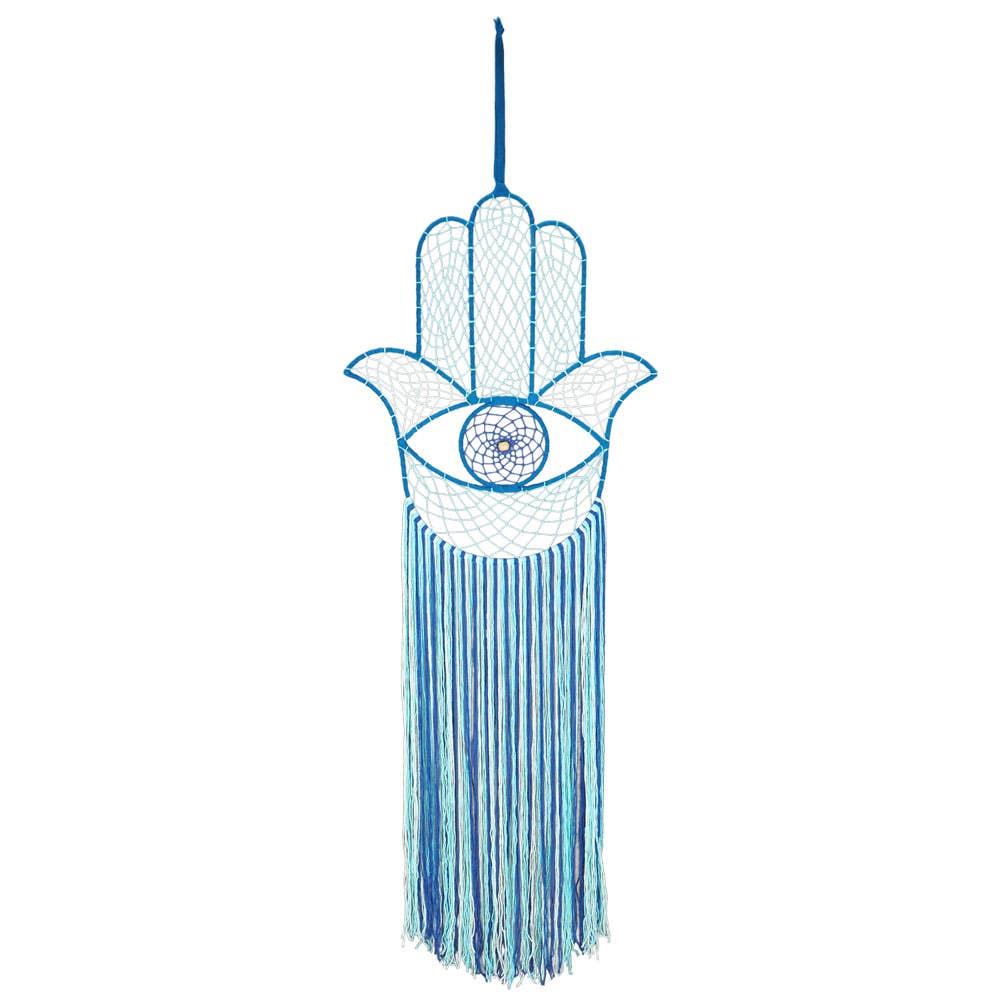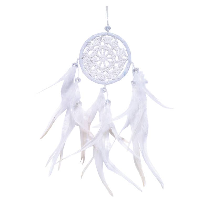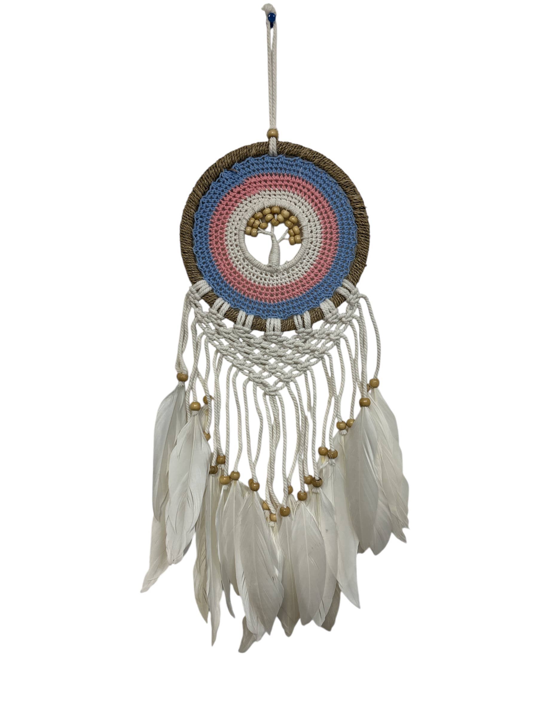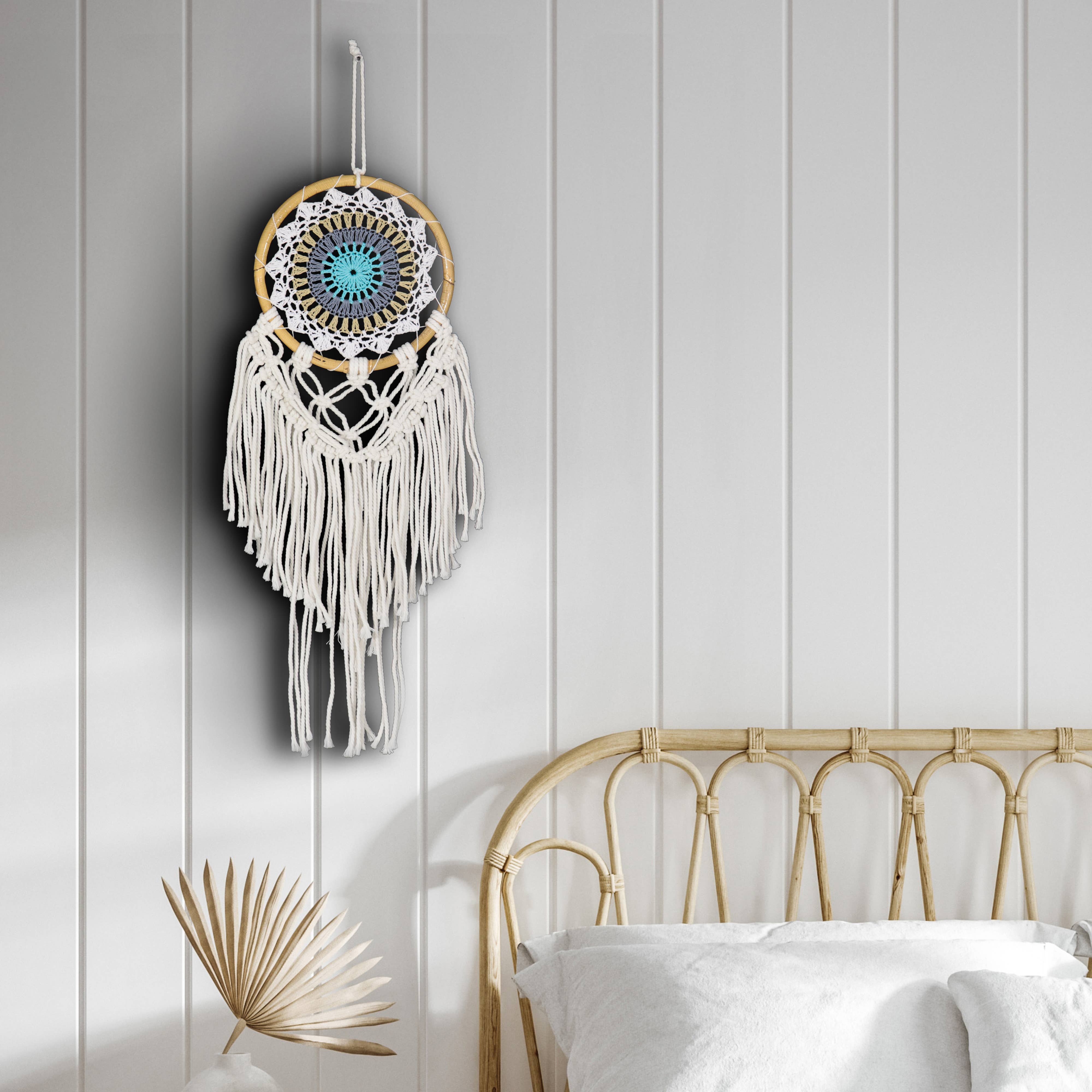 Add a touch of whimsy and tranquility to your living space with the Blue and White Dreamcatcher with Crochet Eye from Benjamin International. This dream catcher is a testament to our brand's mission of bringing unique design motifs from around the world to your home. It is an embodiment of Benjamin International's dedication to promoting global exposure and supporting artisans in emerging markets like Nepal, Indonesia, and India. Hang this dreamcatcher in your home and let it be a constant reminder of the beauty of global craftsmanship.