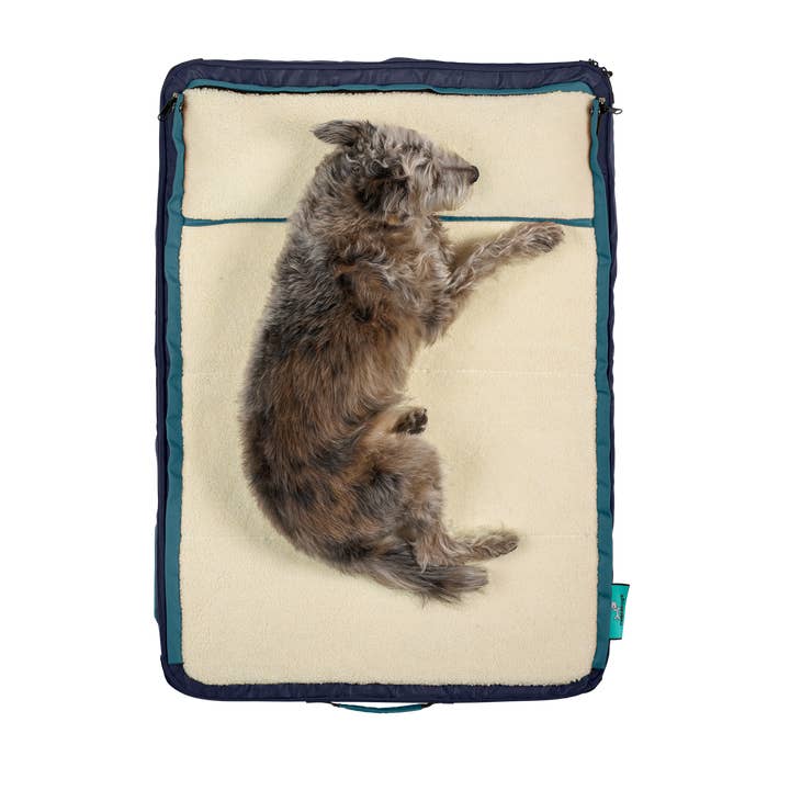 Introducing RuffRest® Stormy - a classic grey color combination that goes with everything. Features a cream sherpa fleece, storm cloud-grey fabric, muted blue trim, and black accents. Specifications: * Weight: Small 4.5 lbs // Medium 6.6 lbs // Large 10.4 lbs * Built-in, modular, 3-season sleeping bag with temperature control vents (*Not for temps colder than 55° F/13° C*) * Hangable, at-a-glance organizer with large pockets to pack your pet's things * "See-at-night" reflective loops to hang up the bed or attach carabiners * Zipper hood trim throughout to protect your pet from zippers * Dedicated inner space that turns your pet bed into luggage * Shoulder strap that doubles as a reflective safety leash * Compression straps (*Only in medium and large beds*) * Medical/Emergency ID Card with Travel Checklist * Removable inner foams with water-proof covers * Dedicated pocket for all included straps * 900D moisture-repellent nylon * Easy-to-clean sherpa flee...