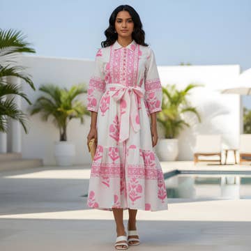 A mini version of our best selling Capri Maxi, our Mykonos Mini has an feminine and flirty silhouette. The dress is hand block printed on 100% European linen with a V-neck opening and matching optional belt. This dress features hidden side seam pockets and adjustable mother-of-pearl buttons at the wrists. - Hand Printed on 100% European Linen - Relaxed and roomy style - Hidden side seam pockets - Coordinating tie belt