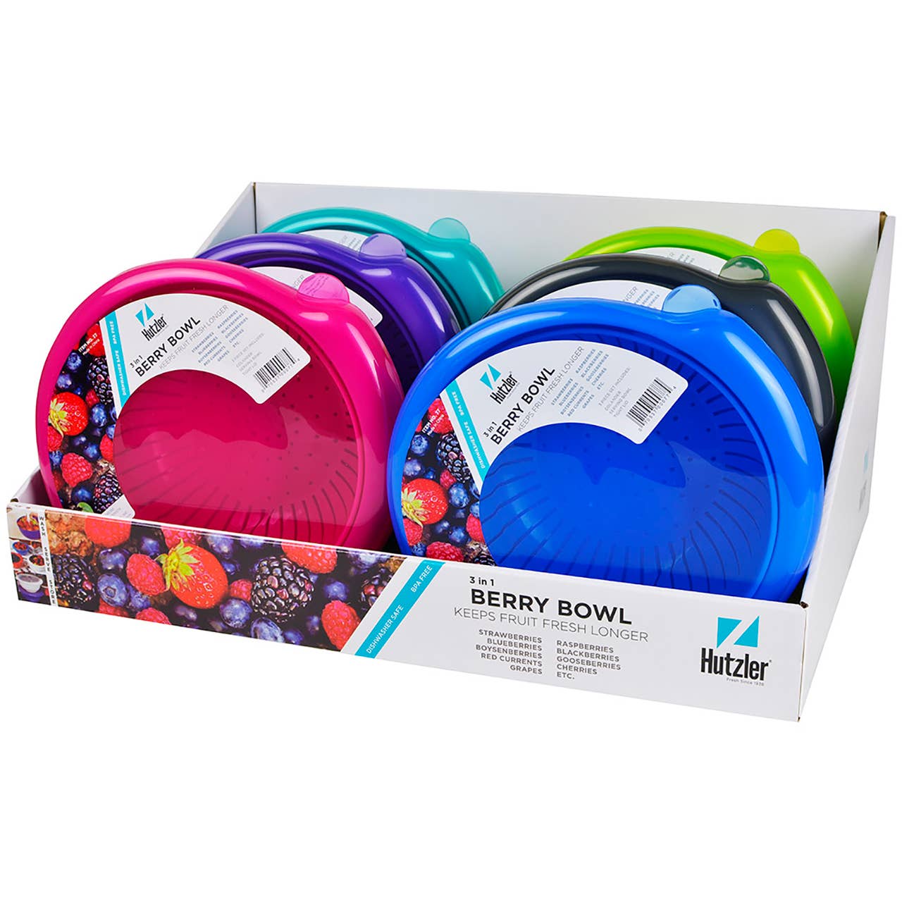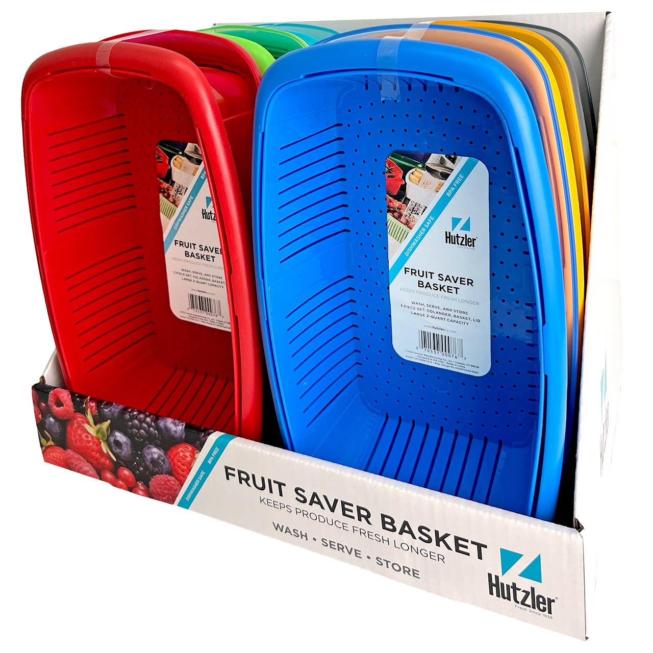 Keeps berries fresh longer! Wash your berries in advance and store them in the refrigerator so that they are ready to eat whenever you want. Berries at the bottom of the box stay just as fresh as those on the top. No soggy berries! The Berry Box resembles a farmer's market basket and stacks easily in the fridge. 3-piece set includes: 1) Colander for washing & draining. Colander fits right inside the box, allowing excess water to continually drain. 2) Serving Box 3) Lid. Open stock case & counter display includes 6 assorted colors.