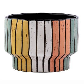 Joshua Pot Product Details Dimensions: Measures approximately 6" x 5", providing an ideal size for a variety of uses while maintaining a compact footprint. Color and Finish: This ceramic vessel features my take on a desert sunset. Glaze colors are Coral, Mustard, Indian Summer and Matte Black glaze with a carved through design all around. Clear Gloss inside. Unique Craftsmanship: Each piece is lovingly handcrafted, ensuring that no two vessels are exactly alike. The absence of a drainage hole enhances its versatility, allowing it to serve multiple functions without compromising its sleek and elegant appearance. Safety and Care: All glazes used are non-toxic, ensuring safety for both plants and people. The easy-to-clean surface makes maintenance a breeze, allowing you to enjoy its beauty without the hassle.