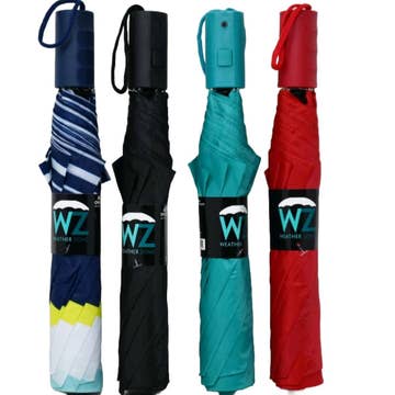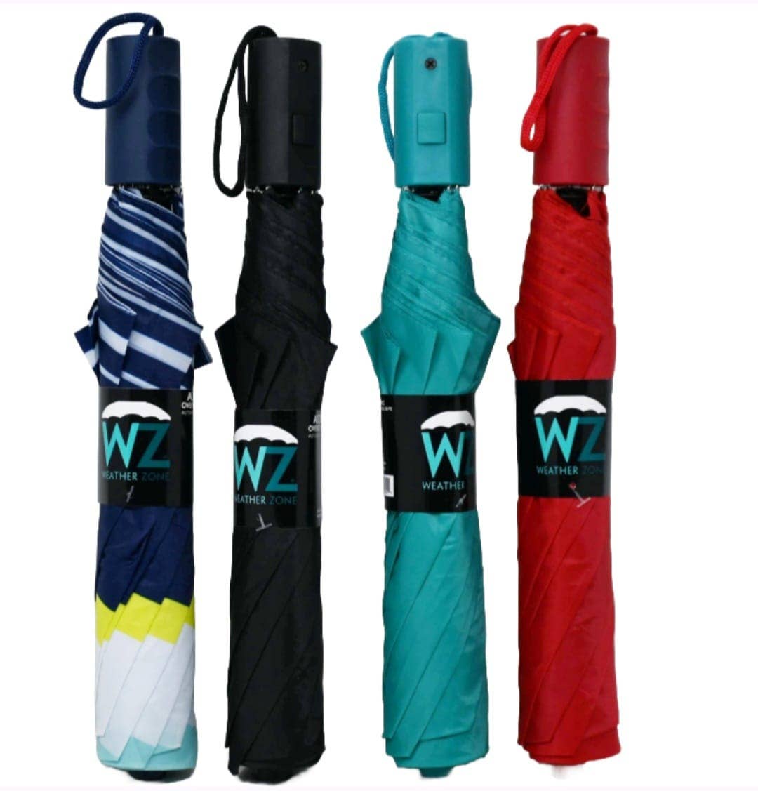 Monochrome Auto Open-Fold 8-Panel Durable Travel Size Compact Umbrella -Assorted Color (4-Black, 3-Burgundy, 3-Navy Blue, 1-Forest Green, 1-Brown, May Vary) -Folded Dimensions: 12" * 2.5" * 2.5" -Opened Dimensions: 40" * 40" * 12" (Dome Length: 22") -Features Monochromatic Sleeve, Black Metal Shaft, Wax Coated Mock Wood Handle, 8 Fiberglass Ribs, Waterproof Pongee Fabric -100% Polyester -CA Prop 65 Advisory