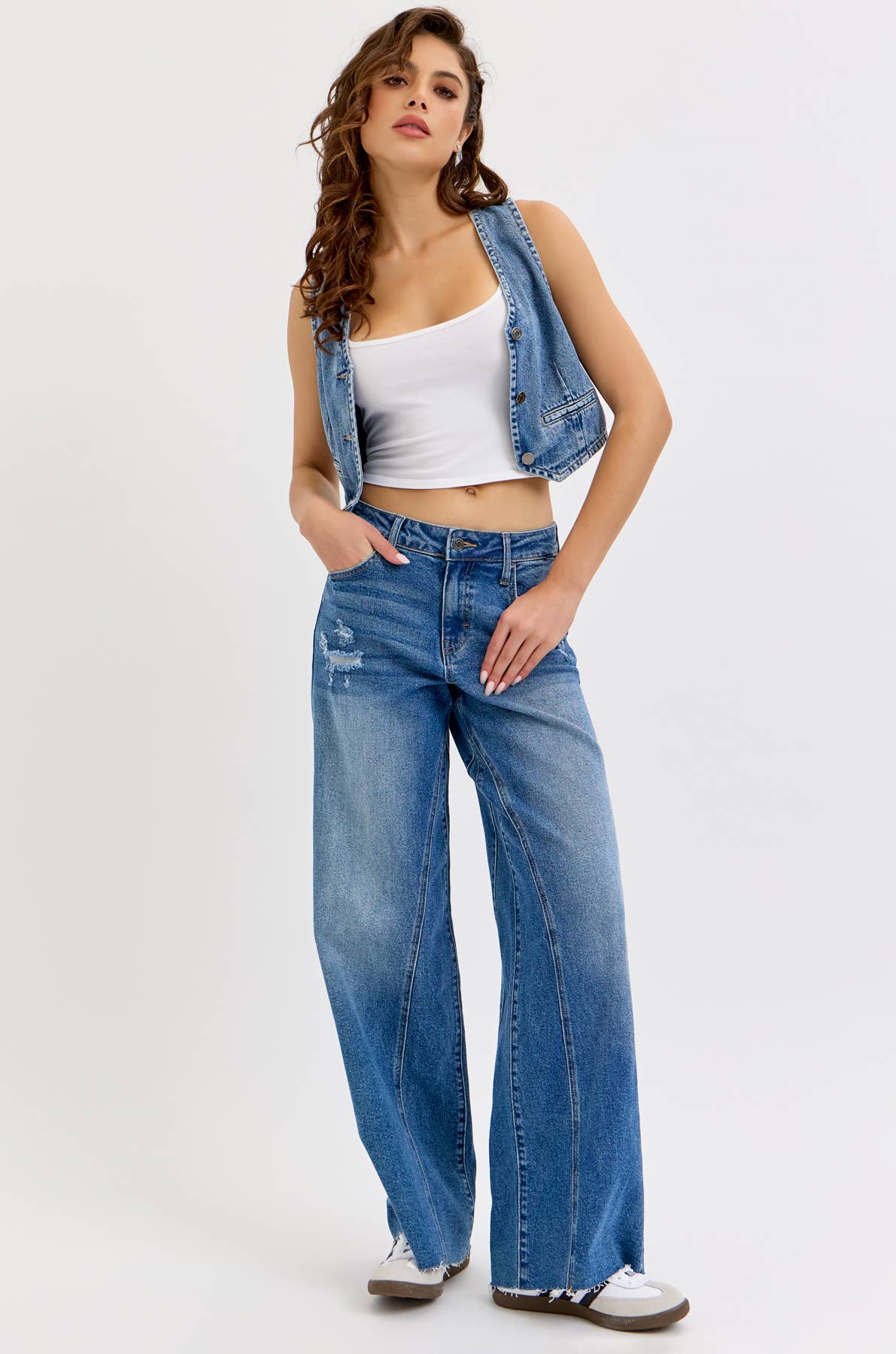 OPEN PACK MID RISE STRAIGHT LEG JEANS MEDIUM WASH STRETCH FRAYED HEM ZIPPER FLY THREE SIDE SEAMS AND SIDE SLITS DISTRESSED RISE 9 1/2" INSEAM 28" IN SIZE 5/26 92% COTTON 6% POLYESTER, 2% SPANDEX 14.2 OZ