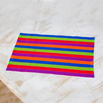 The Maxine pastel rainbow striped placemats are the perfect rainbow accent to add color and texture to any table setting. Stripes of light pink, kelly green, periwinkle, peach, cream, hyacinth, light yellow, sky blue and lilac are woven together to create this brilliantly colorful textile. Ethically handwoven by artisans in Xela, Guatemala.