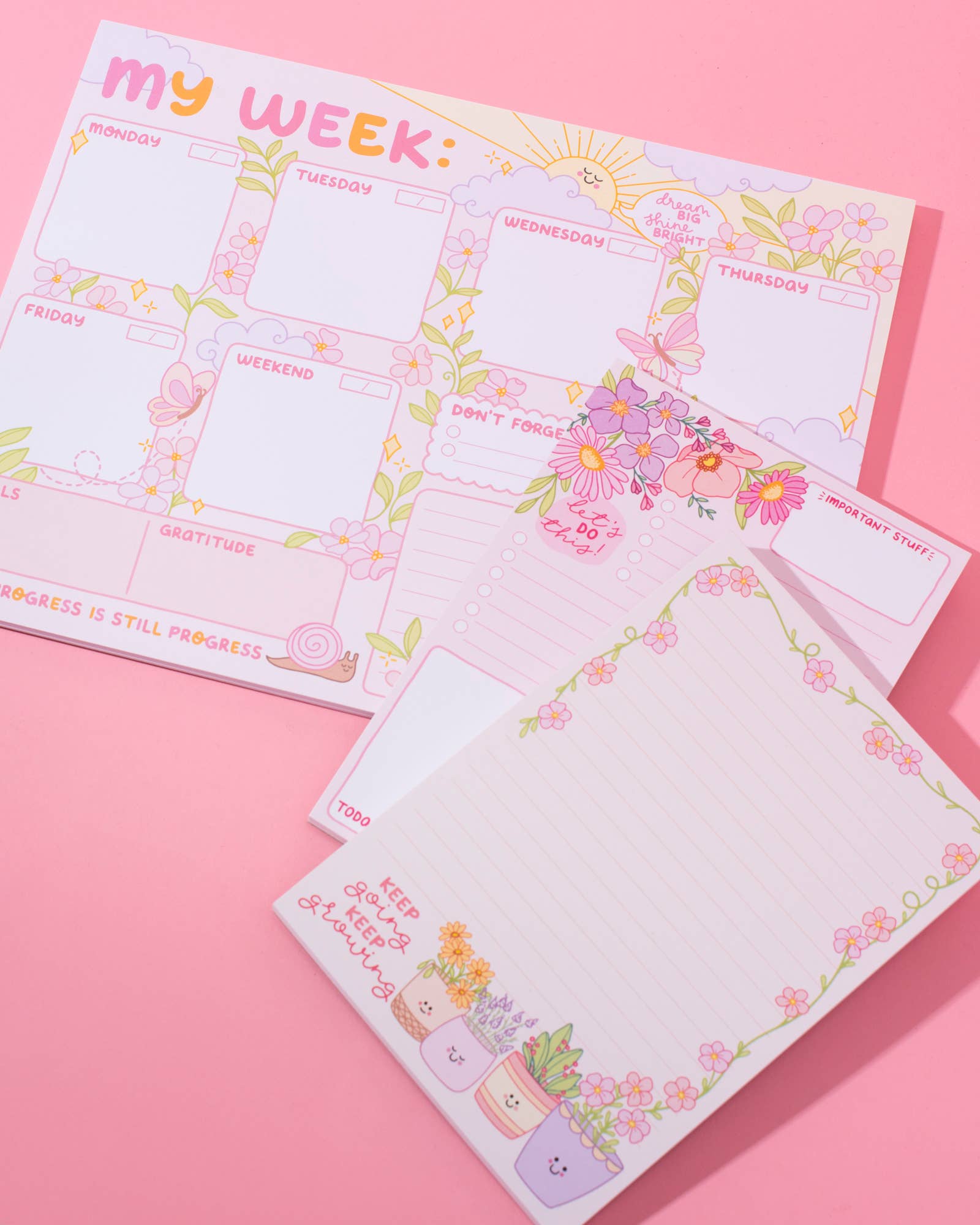This 5" x 7" notepad will make you feel more inspired, encouraged and ready to tackle your daily to-do list. With dedicated sections for planning, this cute notepad will keep you organized and uplifted from sunrise to starlight. Make each day a little more magical with this daily planner pad! WHAT YOU NEED TO KNOW: > 5" x 7" > 50 tear-off pages > Printed on thick matte paper (70lb) with cardboard backing > Professionally manufactured > Packaged in individual, sealed cellophane bag WHY CUSTOMERS BUY: > Adorable illustrations and a colorful encouraging quote to add a pop of positivity to the day > Perfect to add joy to any stationery lover's desk > Sections to organize thoughts, including a dedicated space for gratitude > Write tasks, reminders, notes and more > Makes a sweet and unique gift I will happily place an order with my manufacturer should you wish to purchase more units than what is listed in stock. Please reach out to me for manufacturing and turnaround details.