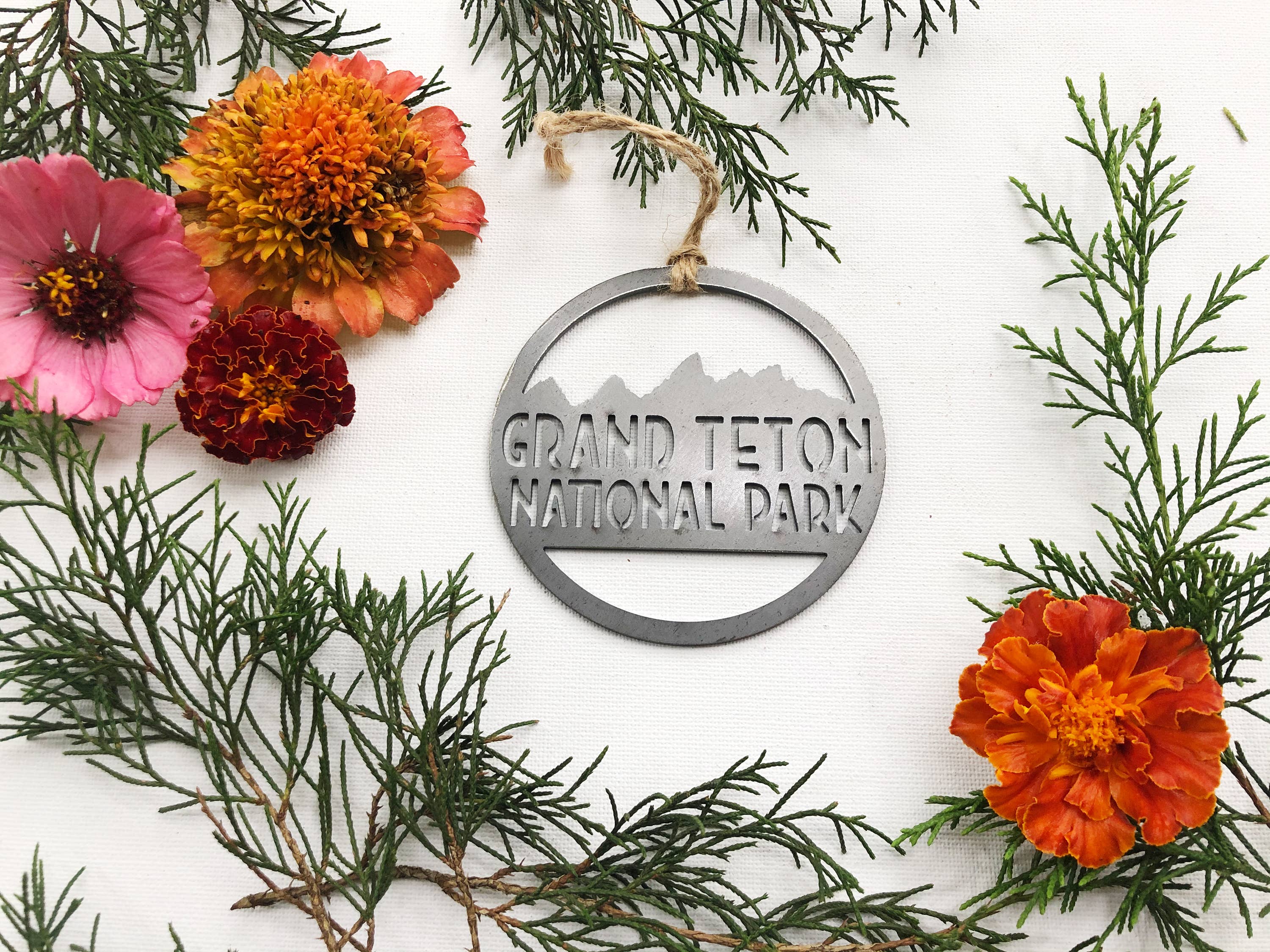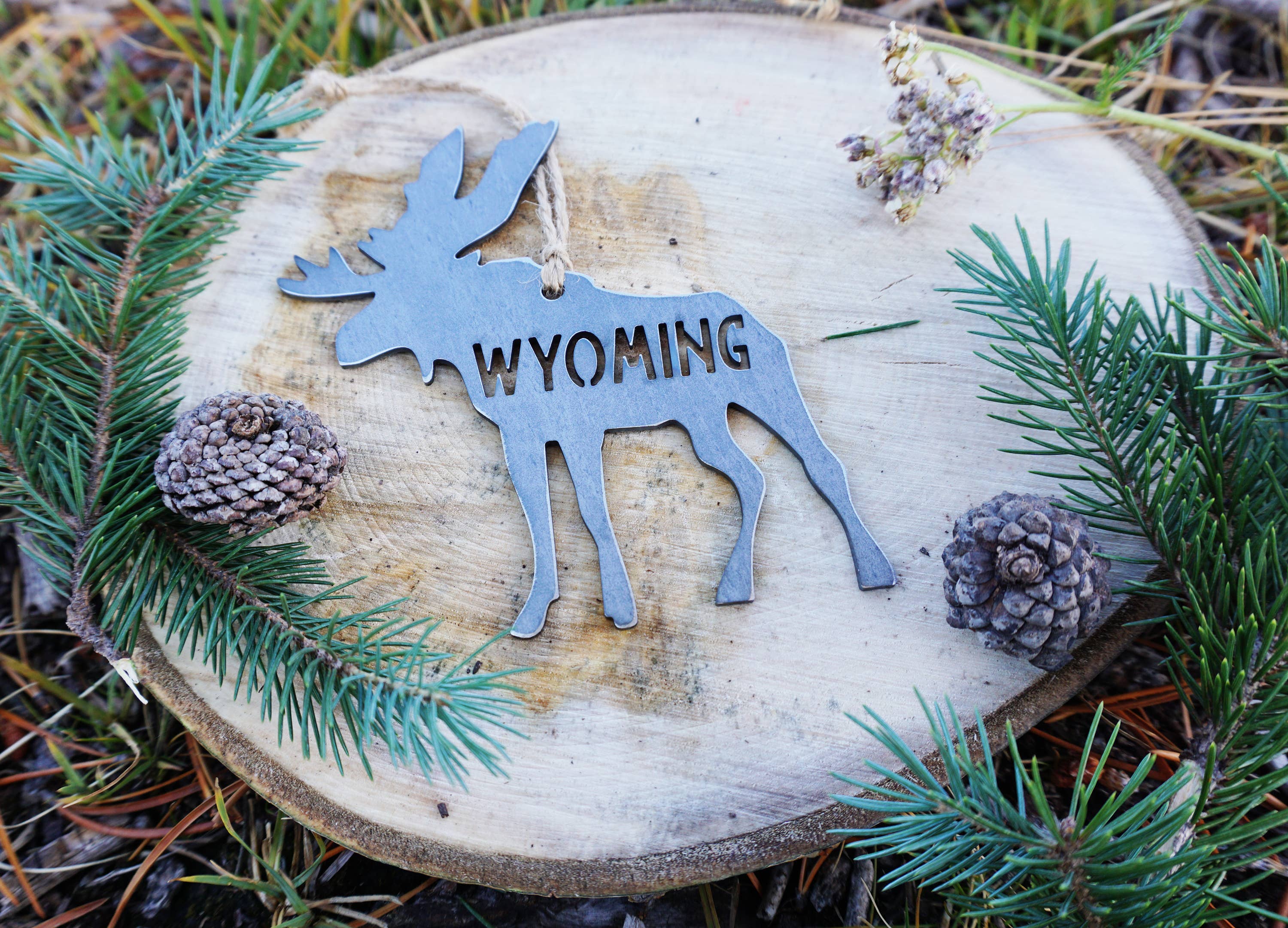 Jackson Hole Ornament (script) All our pieces are designed & created by us in our barn studio in rural north Georgia. The industrial steel we use to create our products is the most recycled material in the world. We have chosen this material for its sustainable nature as well as its rustic appeal. After each piece is cut using our CNC table, we grind and polish each piece to a finish, and complete it with burlap twine. RAW STEEL MATERIAL: We use raw 14 gauge mild industrial steel, which is the most recycled material in the world. The color, shades, and variations in the raw steel (raw metal) appearance varies from sheet to sheet. Due to the nature of working with recycled materials each piece will likely vary from the picture. SHIPPING: All orders are shipped via USPS, United States Postal Service, Priority Shipping with Signature.