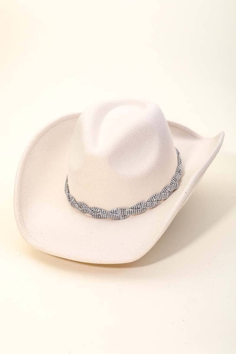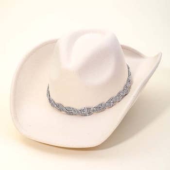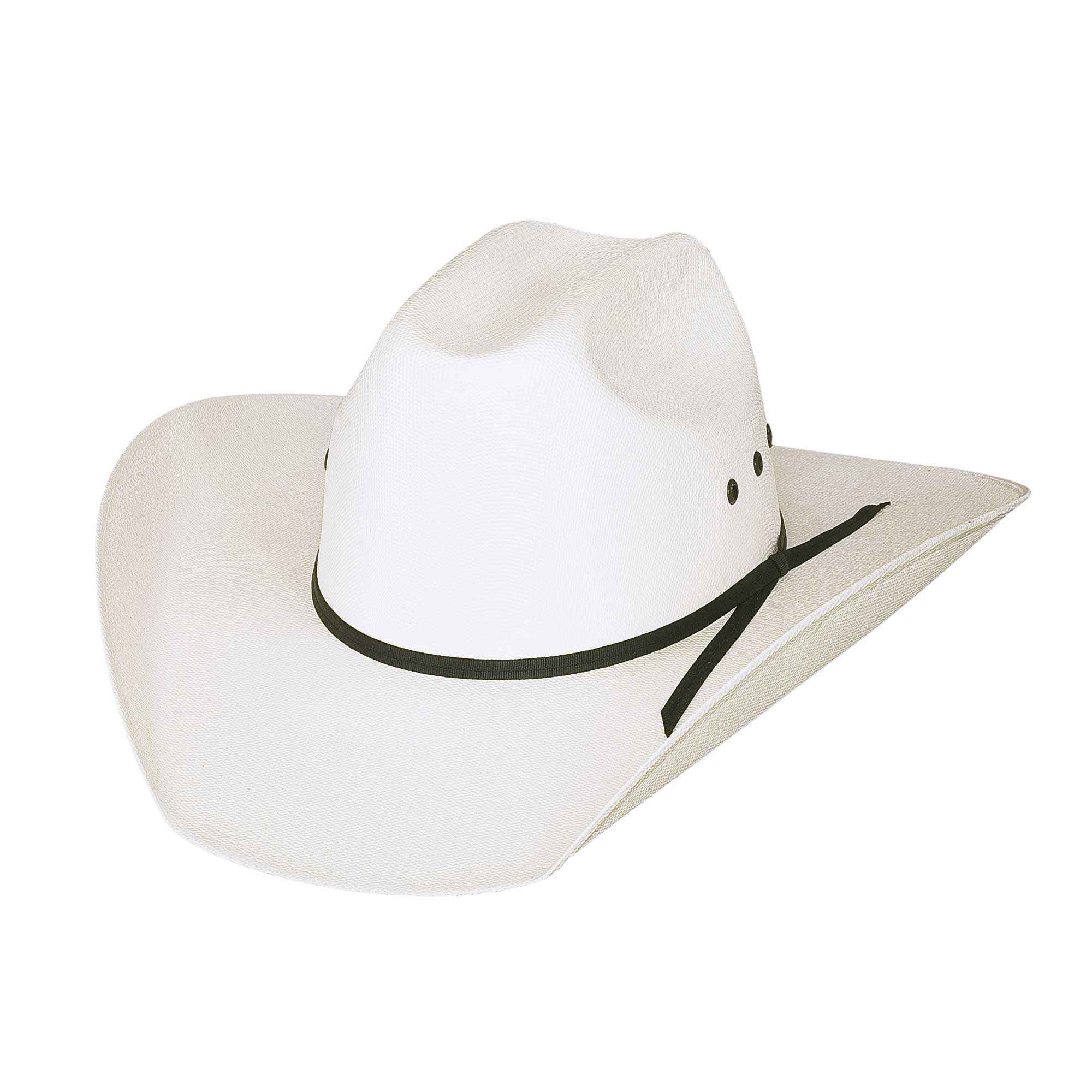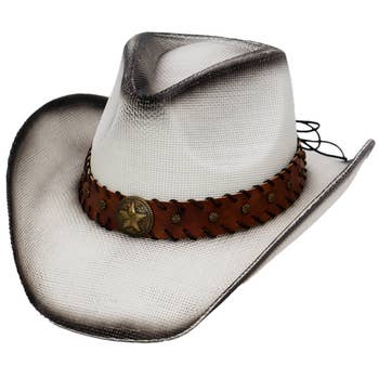 Polyester microfiber, cowboy style, braided leatherette tie around crown, elastic tie in crown This cowboy-style hat made from polyester microfiber, featuring a braided leatherette band around the crown and an elastic tie for a secure fit. The polyester microfiber provides durability and a sleek appearance, while the braided leatherette adds a classic, rustic touch. The elastic tie enhances comfort by allowing adjustable fitting, making it both stylish and practical for various head sizes and activities.
