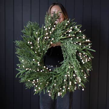 Crafted with ultra-realistic real touch greenery, this high-end Norfolk Pine wreath brings timeless elegance to holiday decorating. Lush, natural-looking needles mimic the beauty and softness of fresh pine, with a full, layered design that feels fresh-cut. Perfect for doors, mantels, or walls, it offers enduring seasonal style without the upkeep. Designed for premium holiday displays in homes, boutiques, and event spaces.