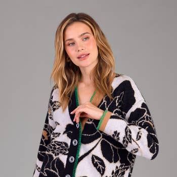 + Floral knit button down sweater cardigan + Ribbed round neck + Button down front + Raglan seam long sleeves + Waist length + Ribbed cuffs and hem + Relaxed fit + Model is 5' 11" 34-25-35.5 and wears a S