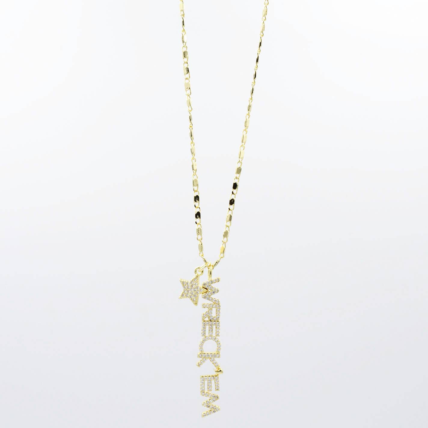 Crystal Encrusted Pave Warrior Nameplate Necklace. 14K Yellow Gold& 925 Vermeil or Silver I inch bar 16 by 18 inch adjustable cut chain Your purchase will arrive in on our custom "Pink Heart" easel-back card. Sourced globally, assembled in Portland, Oregon.