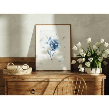 A beautiful cyanotype, aka sunprint, created from a photograph of tulip flowers in a vase. This is a high-quality reproduction print from an original cyanotype. This design option is borderless. Paper Prints Printed on high-quality, lightly textured, cold-press paper with archival ink. Canvas Chart Prints Printed on high-quality matte canvas with archival ink. Includes a wooden chart hanger. Â
