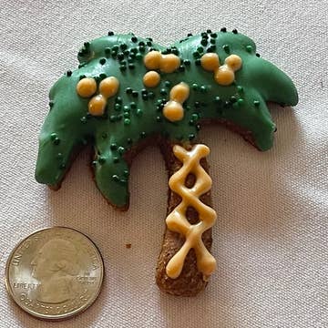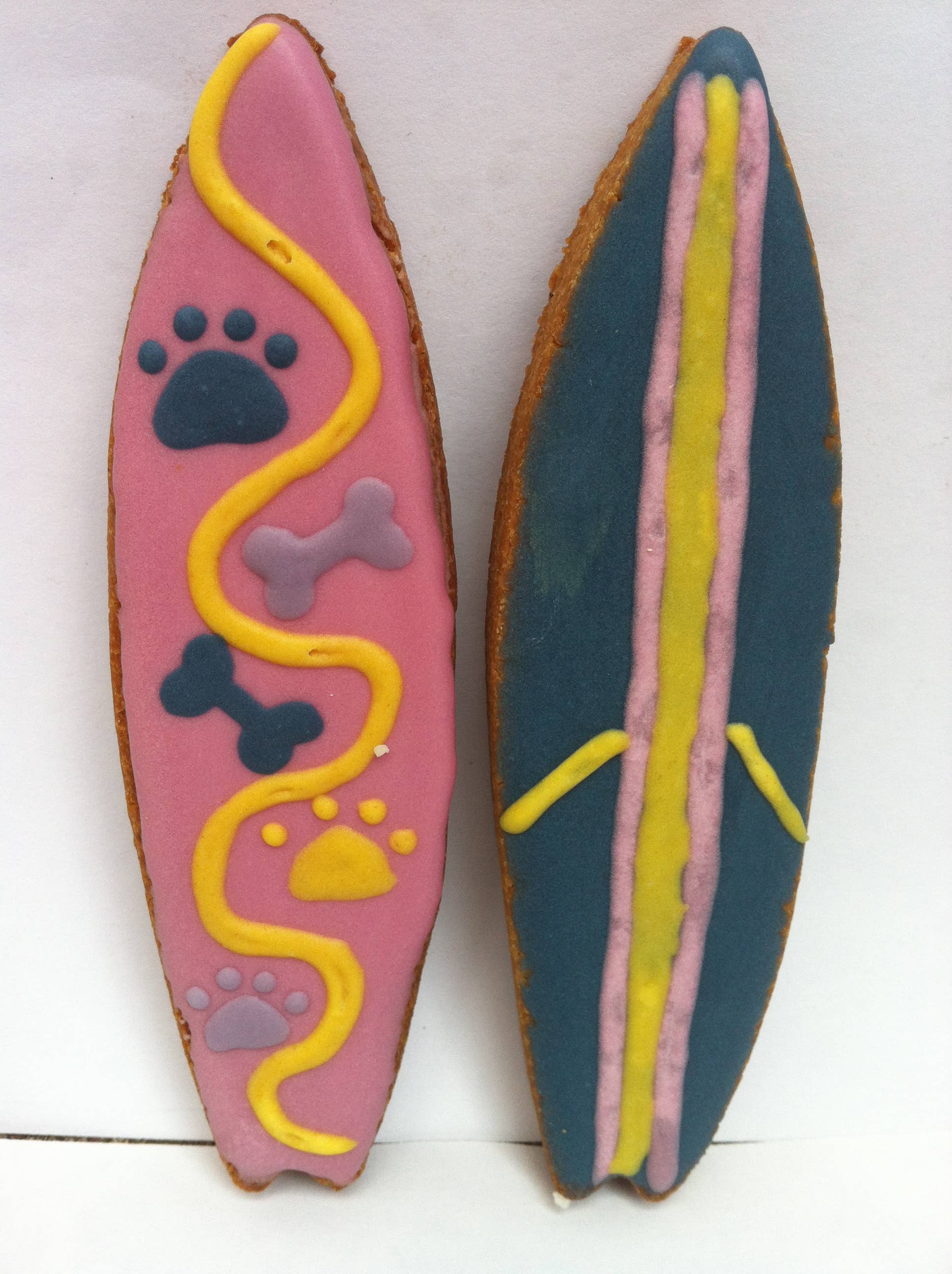 Surf's up! And what's cuter than our surfboards, they're a great option for all those beach locales. Made from our dog favorite peanut butter recipe, it's a best seller all year long. Assorted. Treat Size: 4.75" x 1.75” x .5” - All Natural & Preservative Free - Healthy & Simple Ingredients - Wheat, Corn, Soy & Gluten free - 100% Made in the USA - Everyday & Seasonal Assortments - Woman owned business - Fully owned factory & warehouse in Miami, FL - A portion of all sales goes to the Bubba Rose Foundation, a 501(c)3 charity to help the local stray dog population Ingredients: oat flour, rice flour, peanut butter, eggs, honey and cinnamon. Topped with yogurt coating (yogurt powder, non fat milk powder, modified tapioca starch, egg whites, tapioca maltodextrin, apple pectin, potato starch) and vegetable coloring and carob. Guaranteed analysis: crude protein (min.) 12%, crude fat (min.) 11%, crude fiber (max.) 2%, moisture (max.) 10%