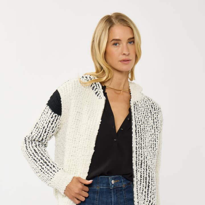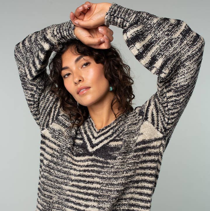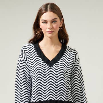 Black and white oversized knit sweater with a round neckline, drop shoulder, and long sleeves. Features a ribbed hemline and side slits. The perfect soft sweater for the Fall season.