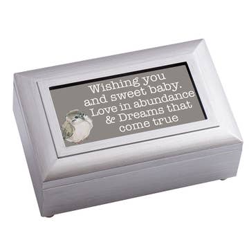 Unleash the magic with our exquisite Silver-Plated Zinc Alloy Baby Duck Music Box, a harmonious blend of beauty and melody that will captivate hearts both young and old. The baby duck features a delightful yellow beak that adds a pop of sunshine while it gracefully twirls to Brahms Lullaby, making it a cherished keepsake for generations to come. Measures 2-1/4 inches long by 2 inches wide and sits 2-1/4 inches high. Carefree finish; no polishing necessary. Hand wash with a warm damp cloth.