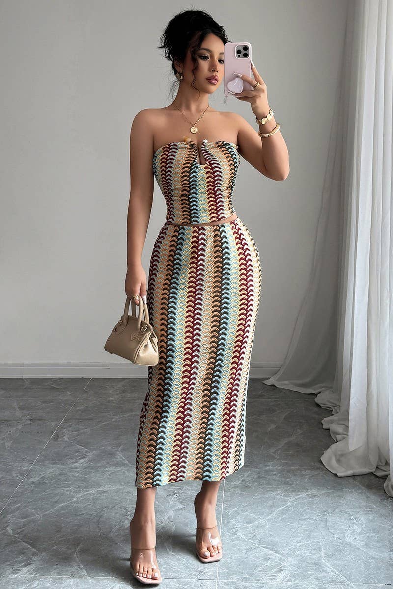 Tropical Waters Print Mesh Ruffle Halter Skirt Set