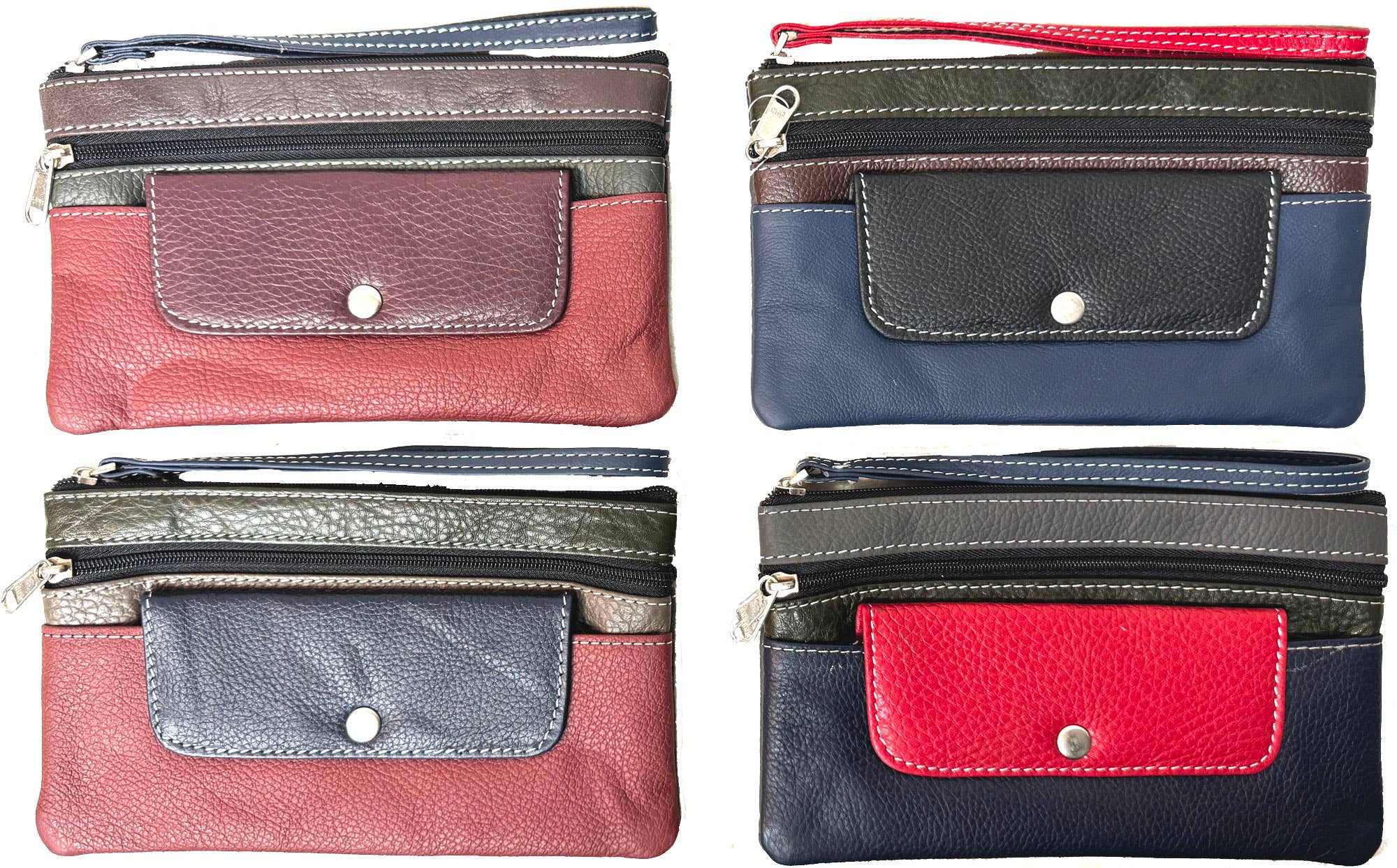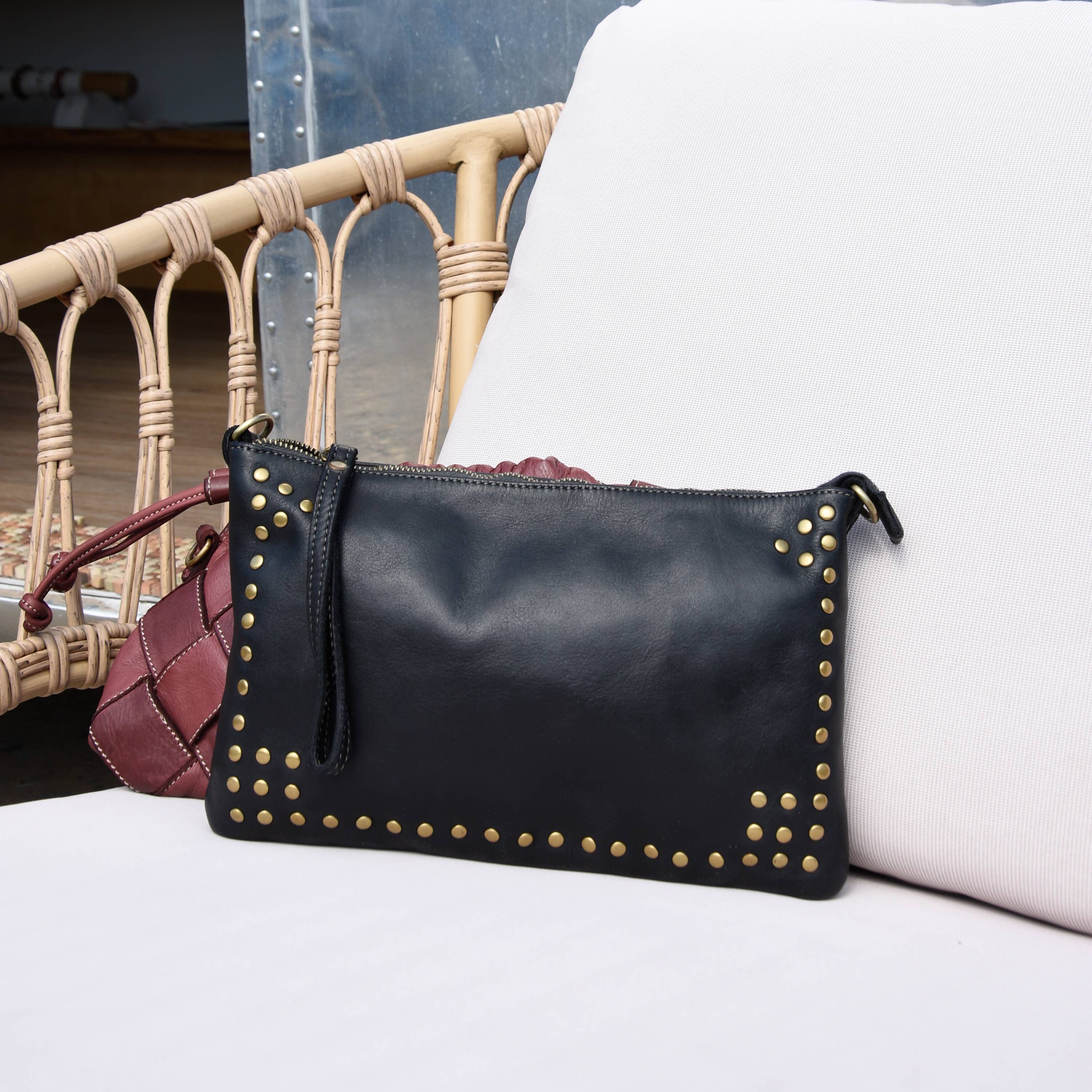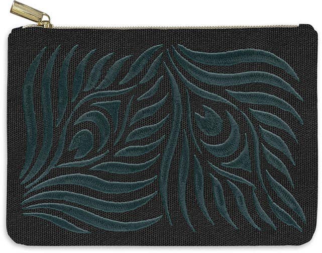 Small embossed lambskin leather pouch. Fully lined with 100% cotton. 1 inside pocket. Wristlet included. Combining versatility and sustainability, this pouch is made from salvaged embossed leather.