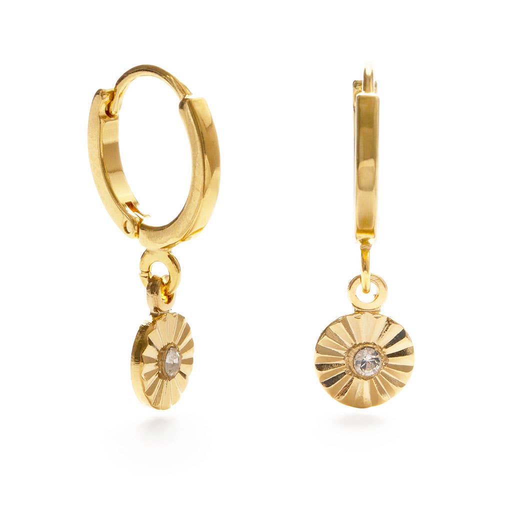 Huggie hoops with .25" disk and Czech crystal. Made of 14k gold plated brass. Designed and assembled in our Sonoma California studio.