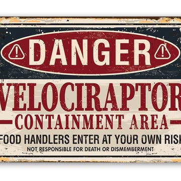 Tin - Metal Sign - Danger Velociraptor - 8"x12" or 12"x18" Use Indoor/Outdoor - Funny Bedroom The Perfect Gift - A truly unique gift guaranteed to bring a smile Durable - 8" x 12" or 12" x 18" Aluminum metal sign printed with epoxy ink so you can hang it inside or outside Easy to Hang - Comes with two screw holes and it's light enough to be mounted with double-sided foam tape or Command Strips Guarantee - I´m so sure you´re going to love the sign. Made in the USA (Tomball, Texas) in our family-owned shop