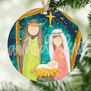 Olive Wood Round Nativity Scene Ornament with Star Modern and German Style Olive Wood Round Nativity Scene Ornament with Star Ornament This unique design was exclusively made out of the Bethlehem Olive Wood. Add a special touch to your Christmas Season with this beautiful Bethlehem Olive Wood Ornament. Engraved with precision to show all the small details. Comes with a golden string (ready to hang).