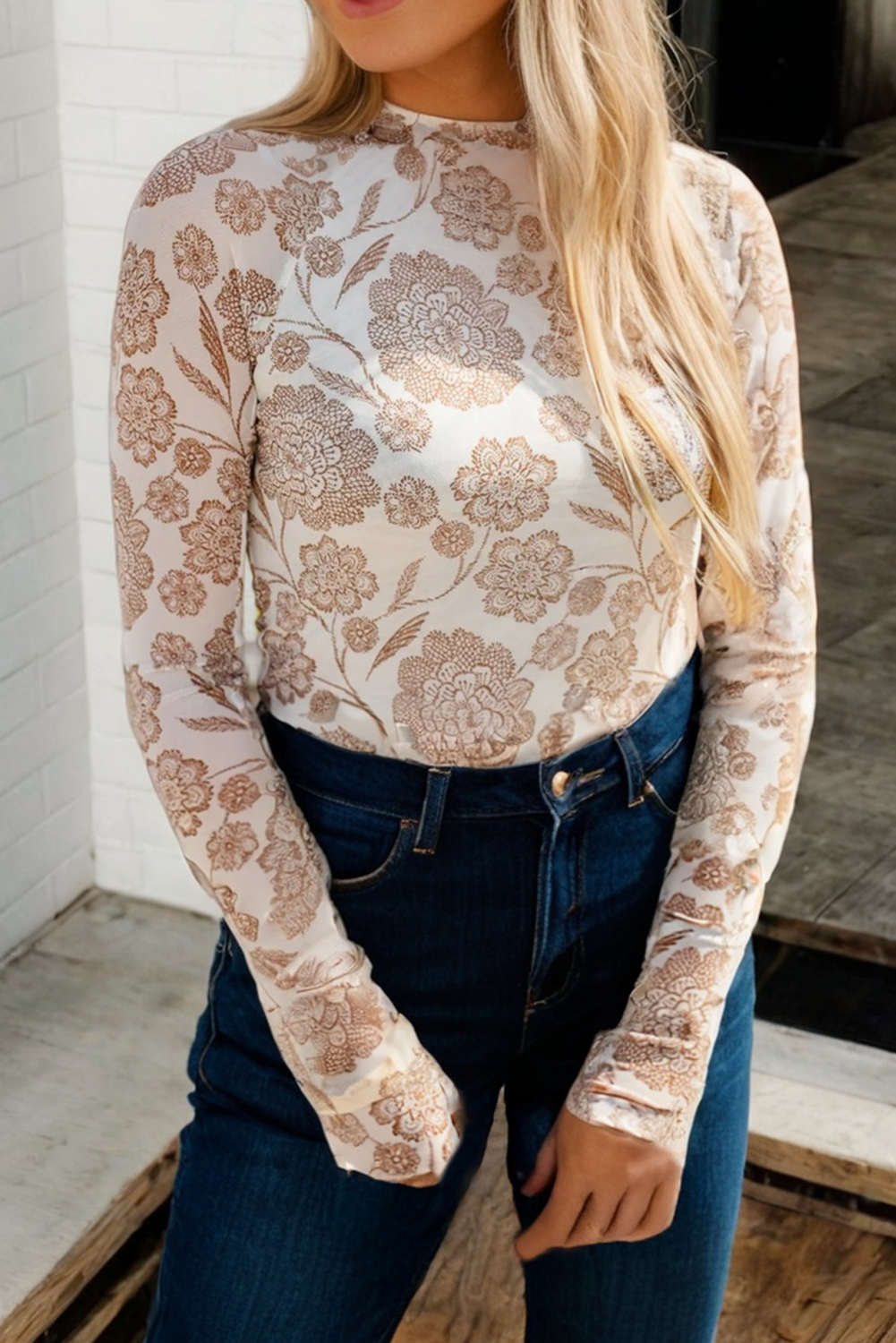 LDC Floral Lace Patchwork Long Sleeve High Neck Slim Top