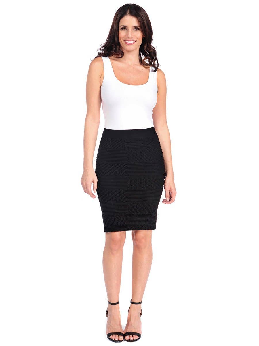 Our Lattice Pencil Skirt is the ultimate in figure-flattering and versatile, travel-friendly wardrobe staples. Combining our signature shape-smoothing fabric with a long and lean pencil silhouette--with added lattice texture detail for an ultra-slimming effect. Hits just above the knee, with a seriously soft waistband for the perfect, dig-free fit. Pair it with a simple sweater and pendant necklace or try it with one of our Lattice-textured tops for a dress-like outfit that maximizes your travel wardrobe! So many options. Trust us, you'll love our slenderizing textures! Proudly Made in the USA. • Ultra-comfortable fit, wear after wear • One size fits most (REALLY!) • Machine wash cold, delicate, with like colors. Lingerie bag recommended. Hang or lay flat to dry.