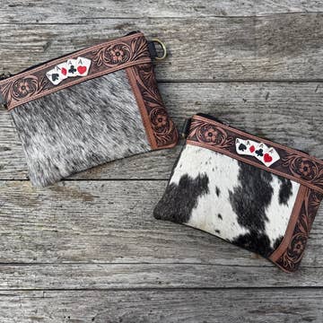 Chile is a super handy cowhide card purse with intricate hand tooled details on the flap is perfect for keeping your bag light by holding a few cards and coins. The hand tooled flap with snap button closure makes this cowhide purse ideal for night out or for a grocery run. n nThis super handy cowhide purse makes a wonderful gift for those in love with the ‘hairon hide’ trend. n n• hand tooling details on flap n n• genuine leather ‘hair-on’ body with tooling detail on front panel n n• snap button closure n n• inside zipper pocket n n• hand tooled leather n n• dimensions: 10.5L X 3W X 8.5H n n*Available in Black & White Hairon, Tan & White Hairon and Brown & White Hairon