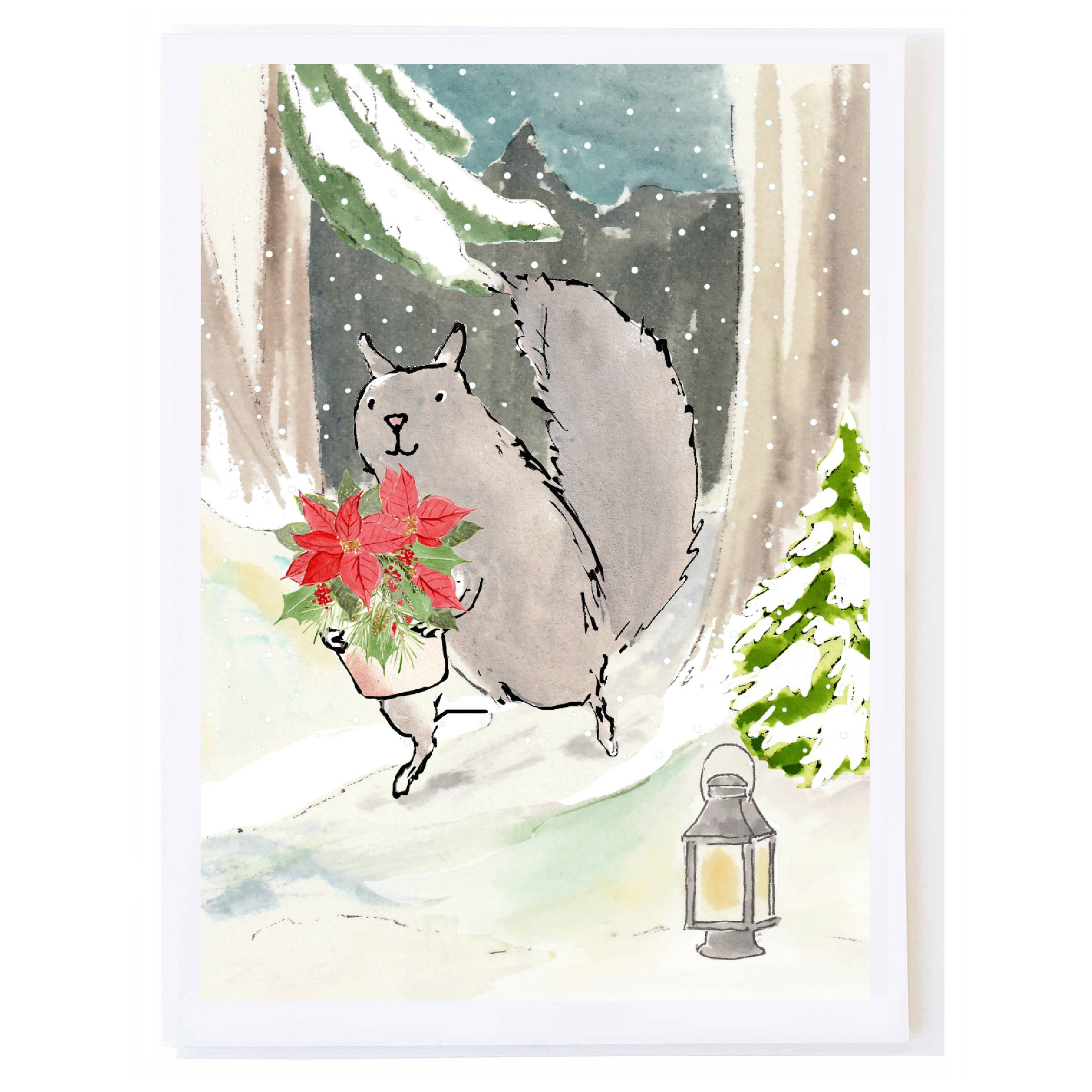 4.25 x 5.5 inches, folded. Blank inside, printed on matte card stock, paired with a white envelope, packaged in a clear sleeve.