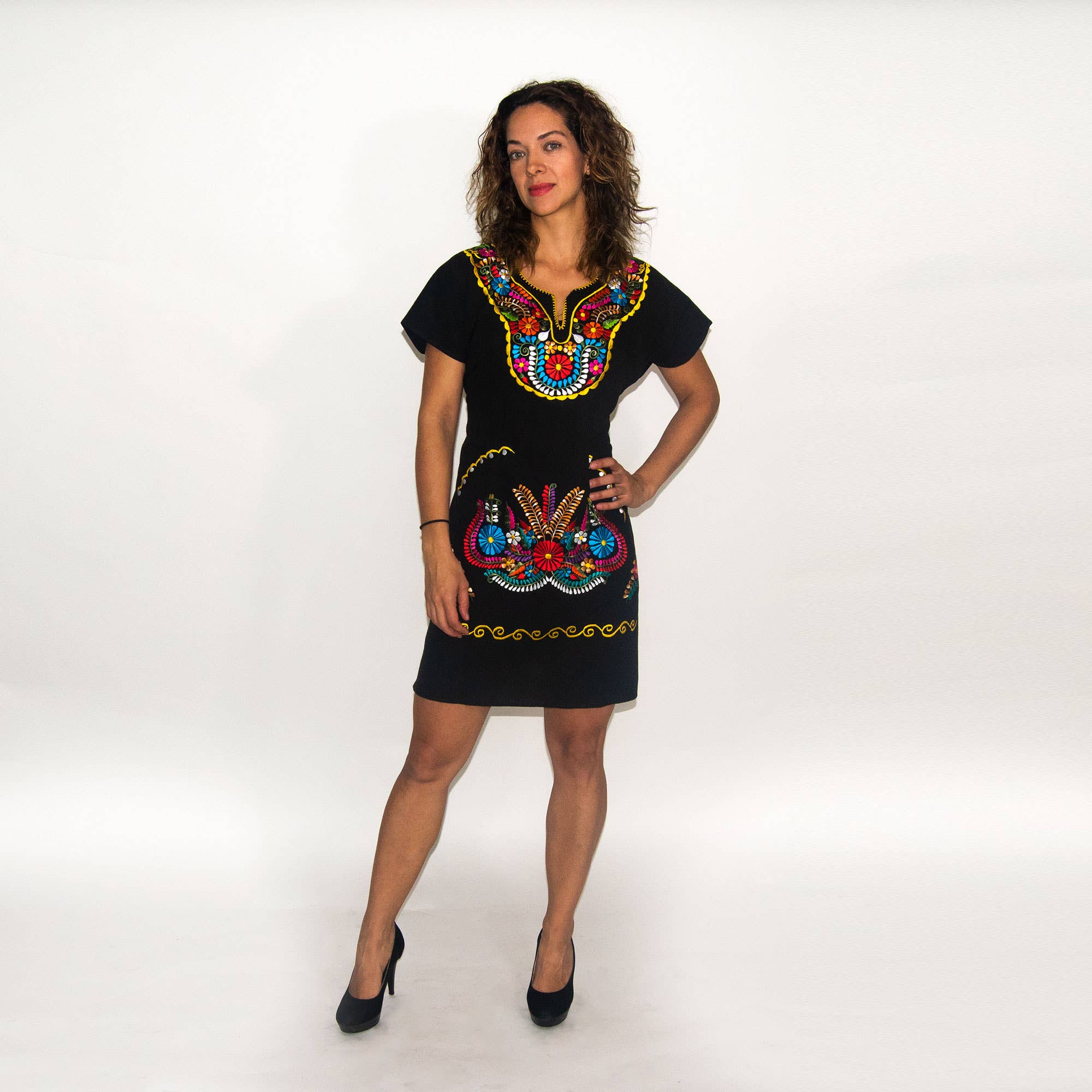 Embroidered folkloric dress by artisan hands in the State of Puebla, Mexico. Cotton multi-color embroidery is handmade form beginning to end. Muslin, 100% cotton fabric. Care: Wash on delicate cycle with like colors. Iron on high heat paying attention to the embroidery.Sizes available X Small, Small, Medium, Large. EACH DRESS IS DIFFERENT BETWEEN THEM, BECAUSE IT IS SUBJECT TO THE IMAGINATION AND THE MOMENTUM OF THE CRAFTSMAN.