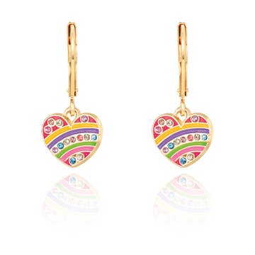 Show your pride with your earrings—one of these earrings reads "queer" and the other features a heart with a rainbow. Both earrings cause joy and smiles. Why match when you can stand out? Cloisonné drop earrings with 18k gold gilt charms catch the light as they move, while airy wires keep them feather-light. Their swing and color stop browsers in their tracks, and the playful style drives strong gift sales.