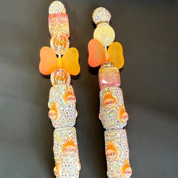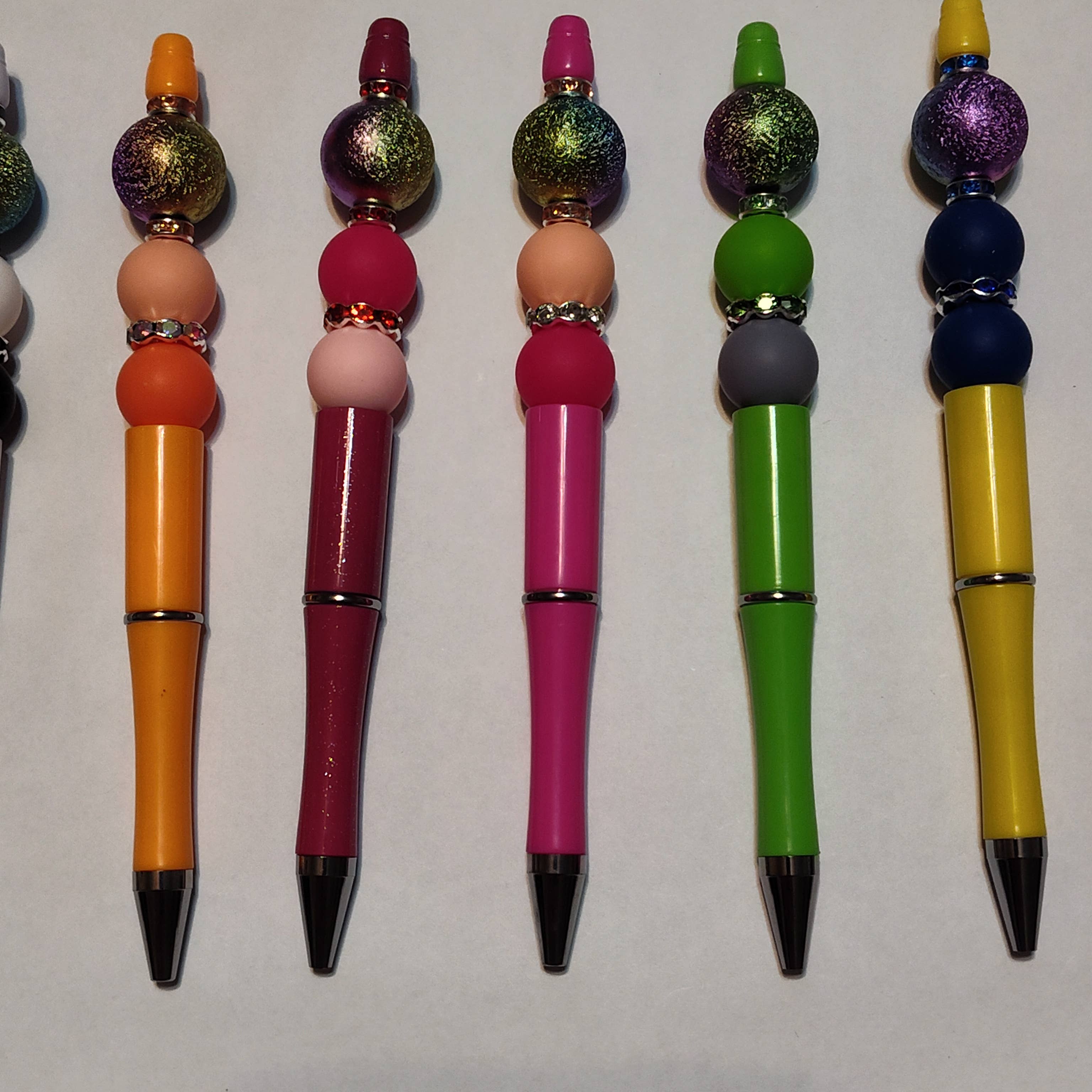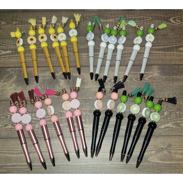 Brightly colored beaded pens featuring a pink, light pink or white sparkly eye catching glittery focal bead on each pen. Each pen comes individually packaged and with an extra ink refill (ink refills not shown in photos.) Hand made in Maiden, North Carolina.