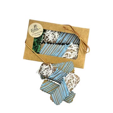 Our farmer's market inspired fruit crate boxes are as adorable as they are healthy. Besides being a vegetarian treat, blueberries are filled with so many antioxidants and healthy properties, these are a great addition to any dog's treat jar. Box Size: 4" x 4" box (contains 5.9 oz. of treats) - All Natural & Preservative Free - Healthy & simple ingredients - Wheat, corn, soy & gluten free - A portion of all sales goes to the Bubba Rose Foundation, a 501(c)3 charity to help the local stray dog population Ingredients: oat flour, rice flour, blueberries, oats, eggs, beet powder, honey, vanilla extract and cinnamon. Guaranteed analysis: crude protein (min.) 10%, crude fat (min.) 8%, crude fiber (max.) 11%, moisture (max.) 8%