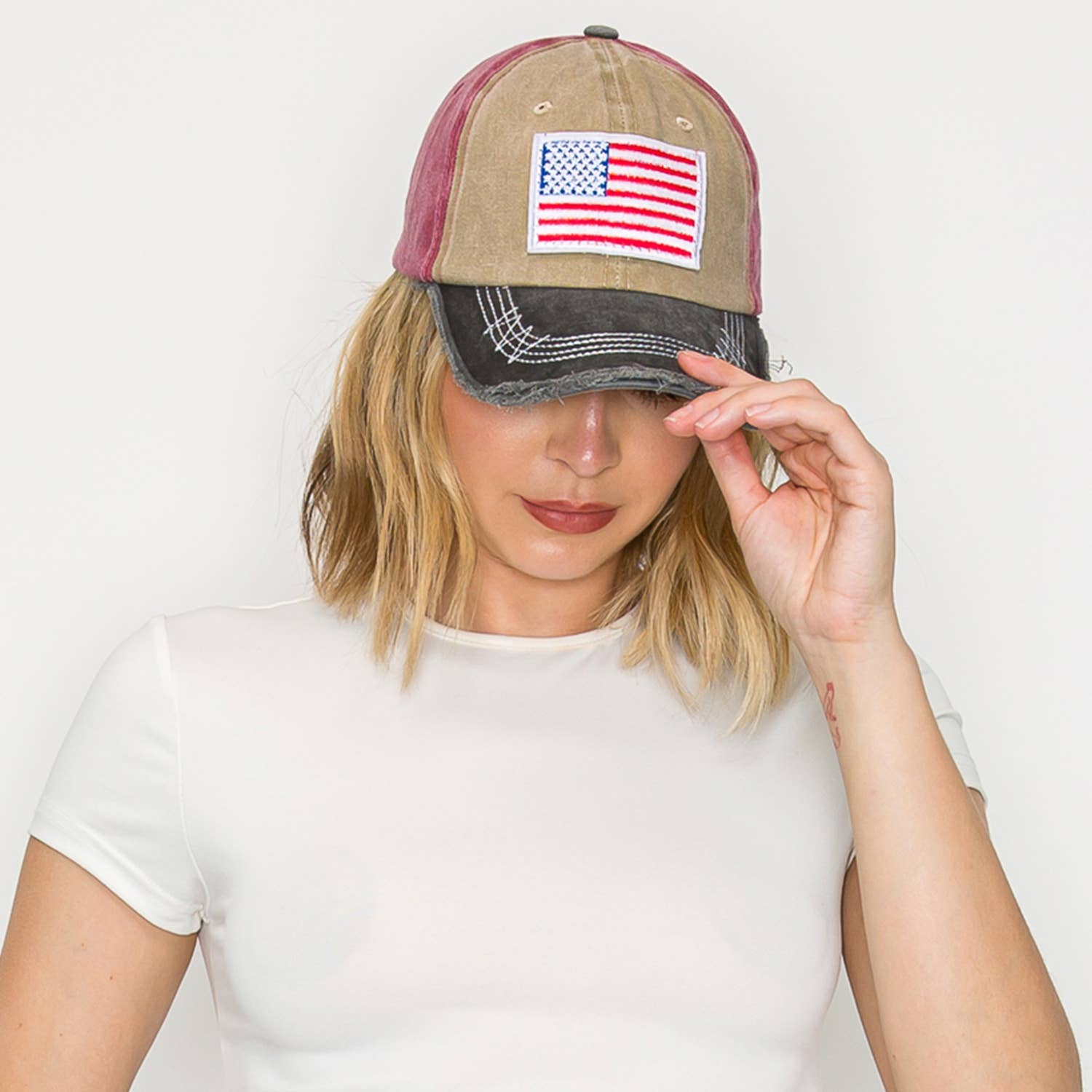 Proudly bold and unapologetically sweet, the American Honey Wholesale Vintage Two-Toned Hat is perfect for the all-American girl who loves her country and her style. This distressed trucker hat features eye-catching embroidered lettering and a classic two-tone design that gives off patriotic charm with a girly twist. From Fourth of July cookouts to summer festivals, it’s made for flag-waving, boot-wearing, freedom-loving customers. With a curved brim and adjustable snapback, it’s as comfortable as it is iconic. A must-have piece for any boutique’s Americana collection. Two-toned hats 65% cotton, 35% polyester machine wash delicate or hand wash one size fits most 5 panel structured hats fabric backing (not mesh) snapback adjustable sizing