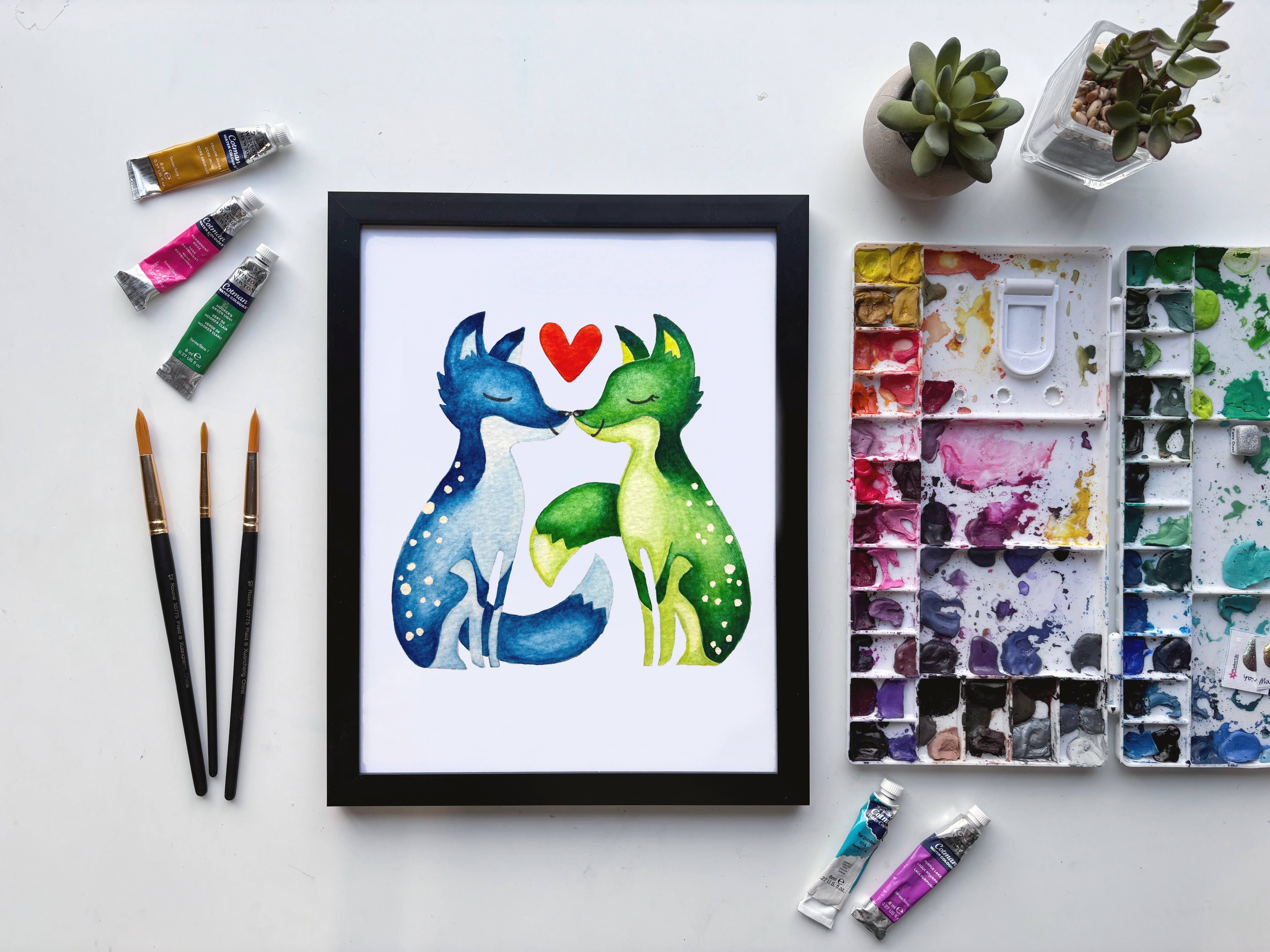 An assortment of woodland friends singing Christmas carols. This image includes a fox, rabbit, penguin, robin, and polar bear Occasions for use: Christmas decor, unique Christmas gift Created from an original watercolor painting by Simran Khaira 8" x 10" art print. Print & board 100% recycled. Made in Ohio, USA. Frame not included.