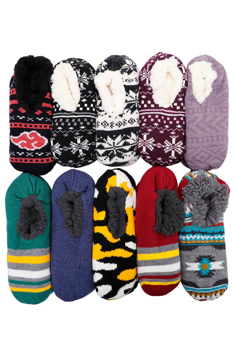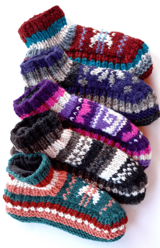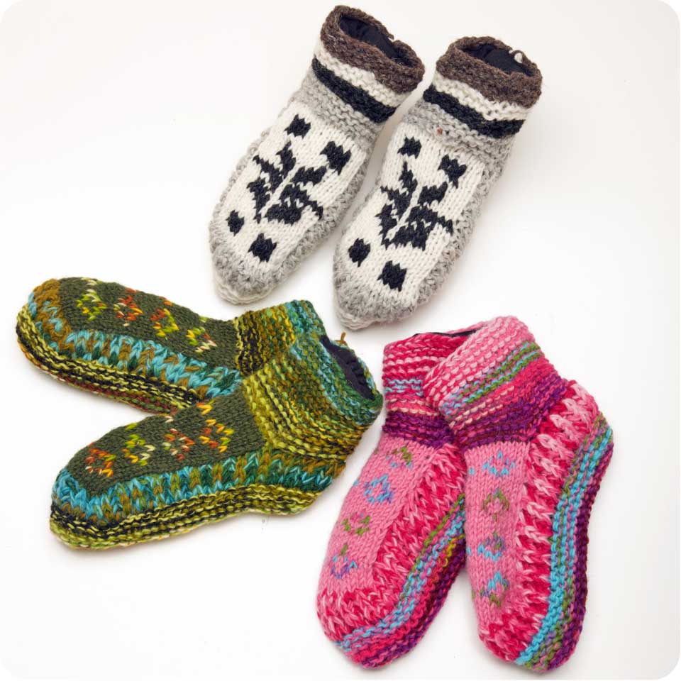Slipper booties with colorful designs, knit wool with fleece lining, adult or child size, hand made in Nepal Assorted colors SKU: ZZSL