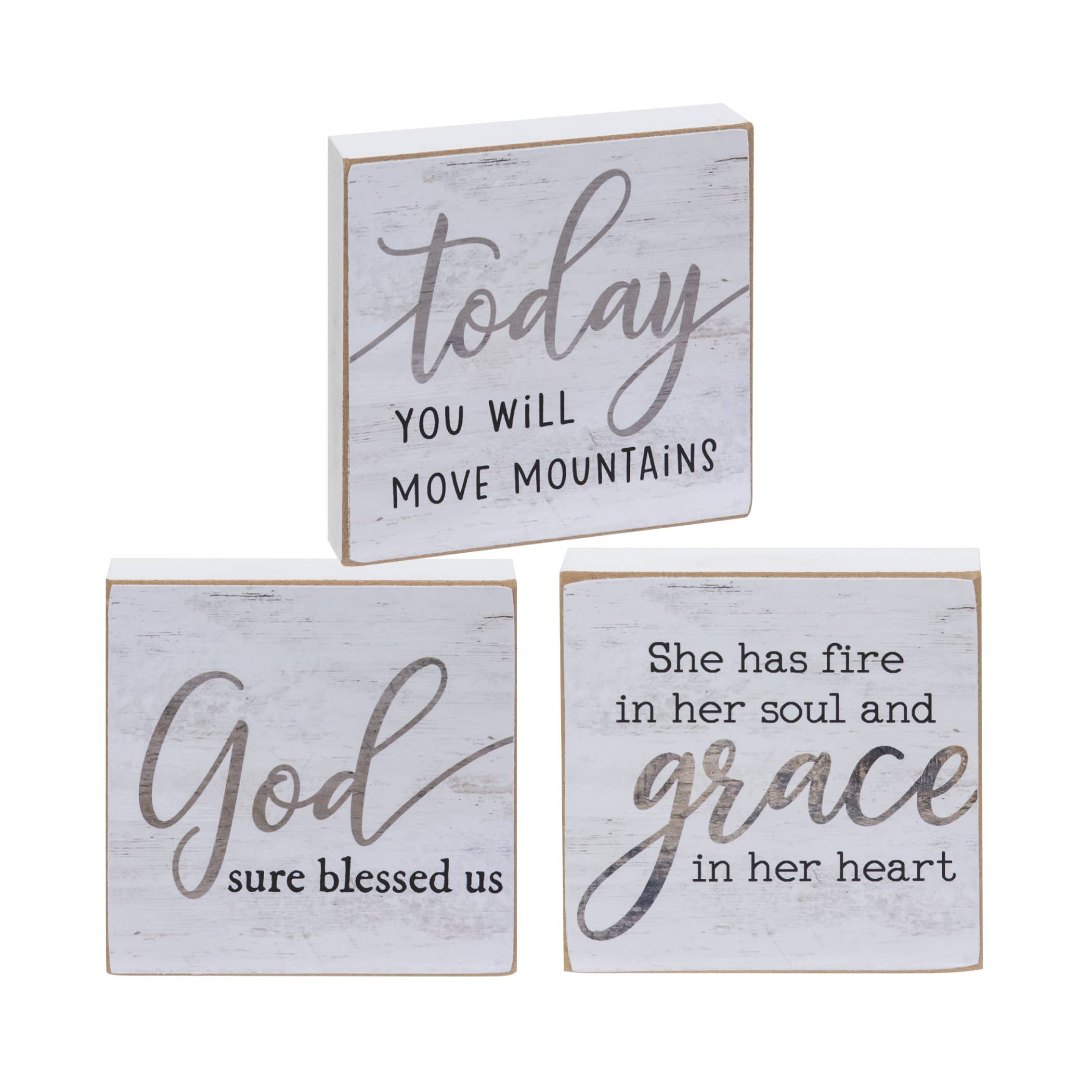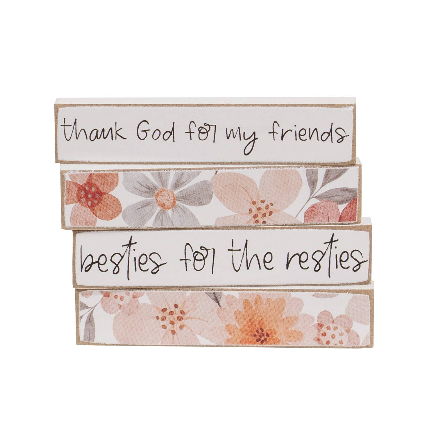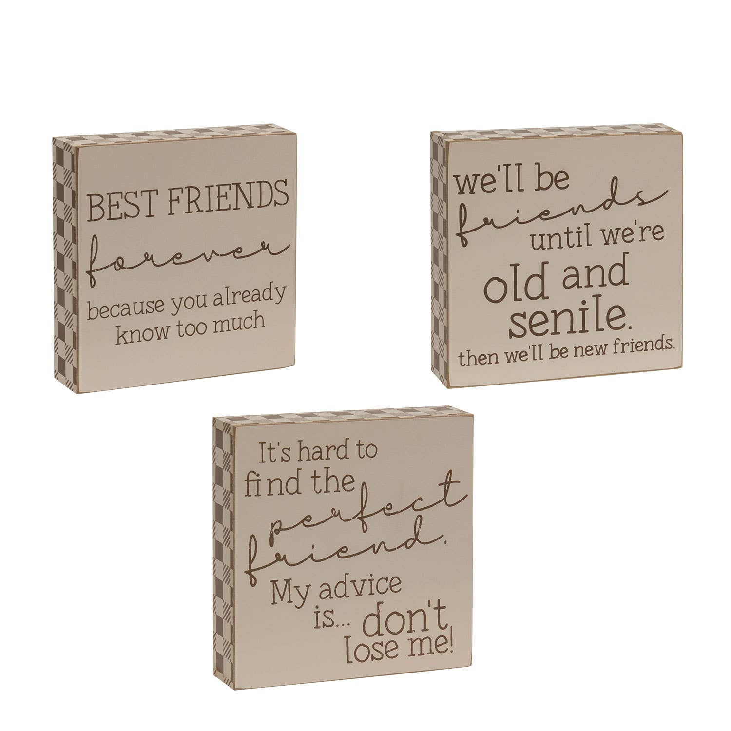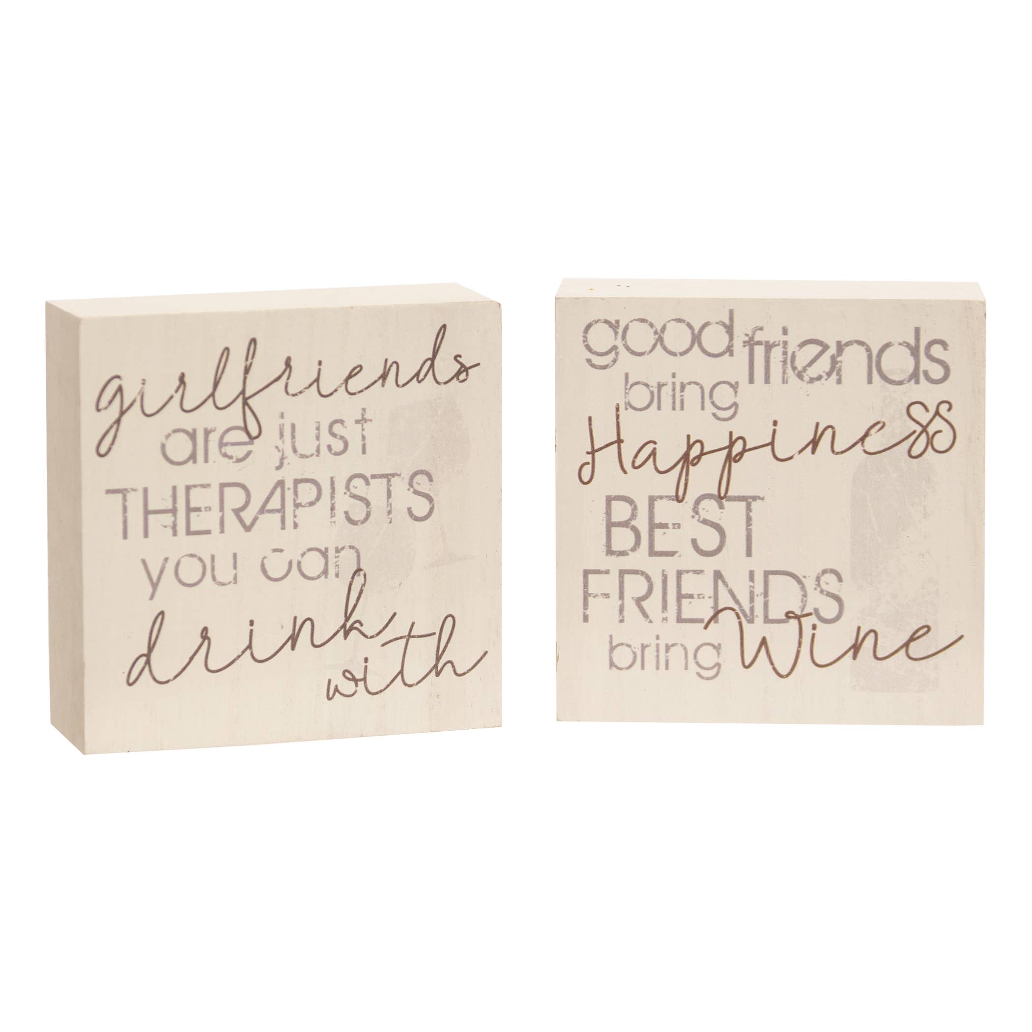 A True Friend Square Block is an assortment of two white wooden blocks featuring subtle distressed and swirl patterns and black lettering. One block reads “A true friend reaches for your hand...and puts a glass of wine in it” and the second block reads “Friend, there’s simply no one else like us. That’s probably a good thing”. Both blocks can be displayed freestanding or can be hung using the keyhole hanger on the back. These blocks are great for year-round décor and make fun gifts. Each block measures 4” x 4” and .75” deep. Please note: This item features an assortment of designs which are priced and sold individually (not as a set). When you order a quantity of 12, you will receive 6 of each style. Color or design is not interchangeable.