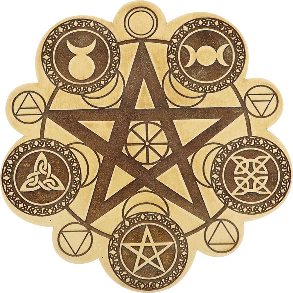 This is a Mandala crystal grid made out of Maple wood. These are made to order, you can choose between approximately 4, 6, 8, 10 and 12 in diameter and 1/8" thick. This is just for the grid, stones much be purchased separately. A mandala is a spiritual and ritual symbol in Hinduism and Buddhism, representing the universe. In common use, "mandala" has become a generic term for any diagram, chart or geometric pattern that represents the cosmos metaphysically or symbolically; a microcosm of the universe. Crystal grid and healing sets are groups of stones that go together for a purpose. Sets of crystals and stones are used for ritual magickal or spiritual crystal healing purposes or with Reiki-Seichim energy work for healing. Some are generalized and others have specific purposes.