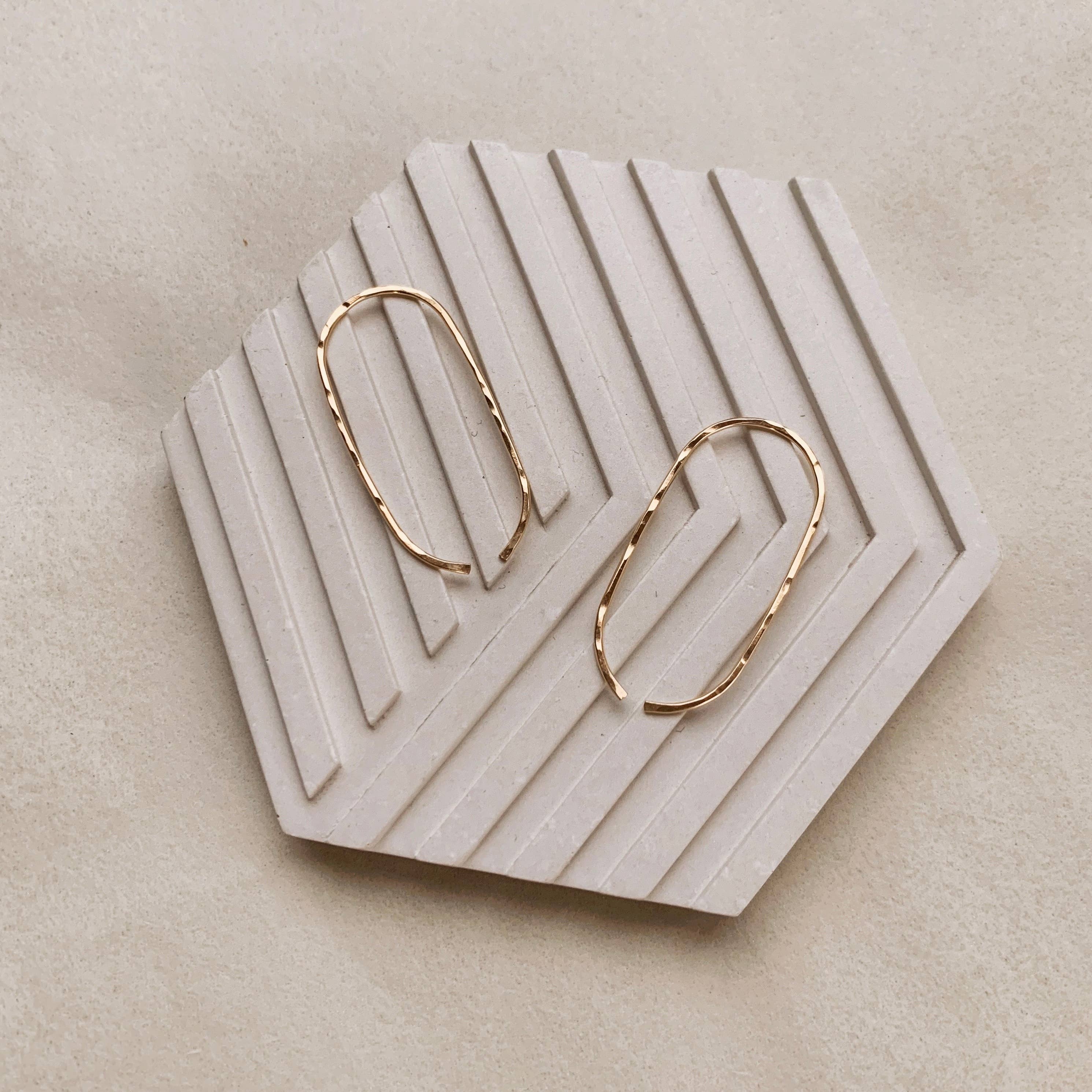 These delicate hammered hoops thread right through your ear. An effortless pair of earrings that can be worn with almost anything. Earrings hang approximately .75” from ear. Materials: 14k gold filled or .925 sterling silver.
