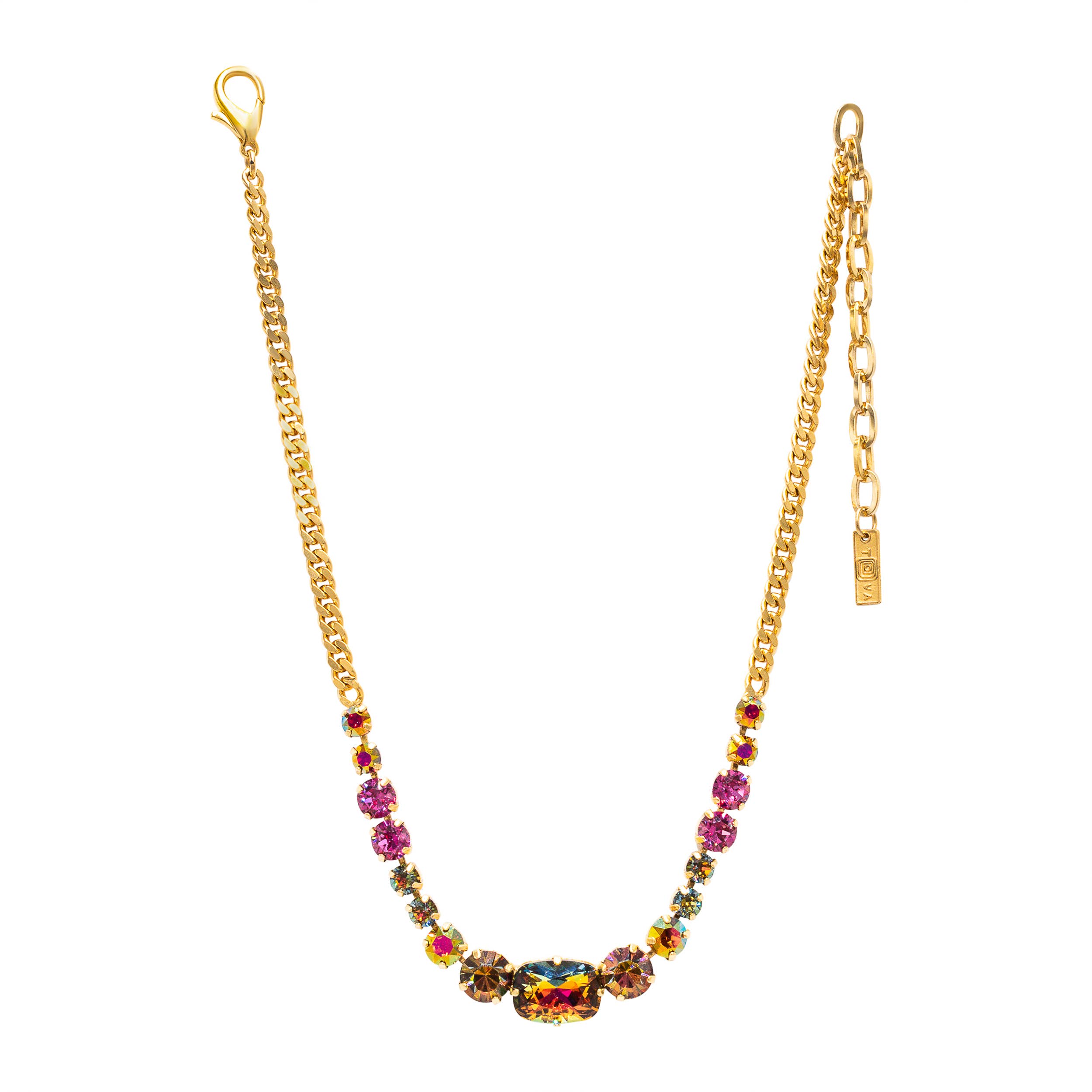 Materials: Swarovski crystals, glass cabochons. Metal: 24k gold electroplated over brass. Size: Chain adjustable 17 x 21 inches, pendant 3 inches wide. Lobster claw clasp. Handmade in our NYC studio. Complimentary gift wrapping.
