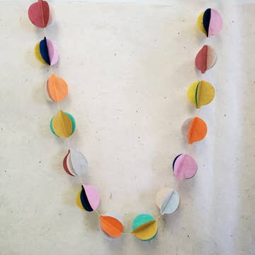 This festive eco-garland is made with sustainably-harvested Himalayan paper. The color info card at the package back shows how the unfurled garland looks. Ready for slatwall or basketing. Sales benefit community schools managed by the producers.
