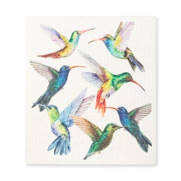 A bundle of 4 Swedish Dishcloths featuring the ruby throated, broad-tailed, anna's and rufous hummingbirds. Swedish dishcloths are an eco-friendly cleaning solution. They are ultra-absorbent and quick-drying, are more sanitary than sponges, are very durable and will last up to 9 months, and can replace up to 17 rolls of paper towels. Dishcloths can be washed in the top rack of your dishwasher or even be thrown into the washing machine. Hang or lay flat to dry. Swedish dishcloths are 100% compostable. SIZE: 6.7 x 7.9 in MATERIALS: 100% Biodegradable cellulose and cotton. Printed with water-based ökötex eco-certified inks. Many mass produced products are created with harsh chemicals that damage our environment. Water-based pigments are environmentally friendly and reduce hazardous waste and negative environmental impact.