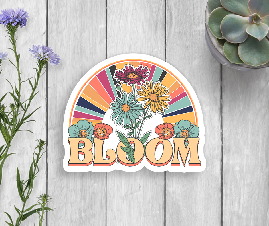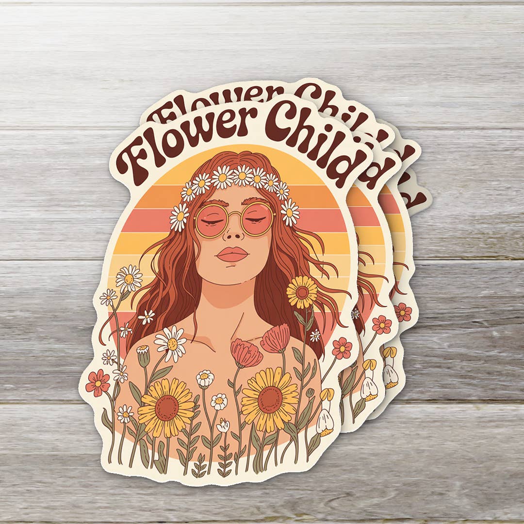Flower Child Bumper Sticker Retro 70's style bumper sticker. Made from durable vinyl that will protect it from scratches, water and sunlight. Removable adhesive that is perfect for vehicles. Apply to clean and dry surface for best results. Dimensions: 4" x 4"