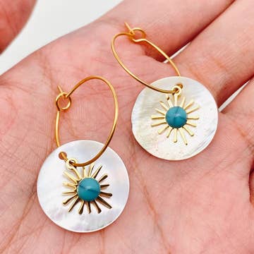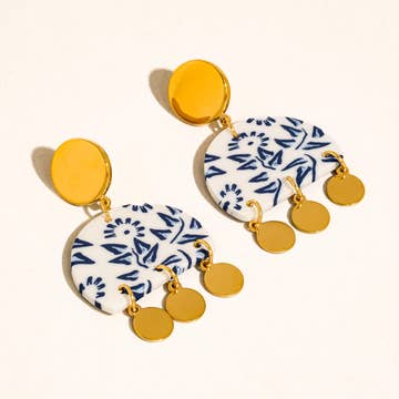 ● 1” hoop, 1 ⅛” porcelain pinwheel ● Nickel-free, 14K gold-filled hardware ● Kiln fired porcelain ● Handmade A bright blue striped sunburst piece suspended on a fine gold hoop. The movement, pattern and color combination make these a really special set. Because each pair is handmade and unique, the shape, size and pattern of the product you receive may vary slightly from what is pictured here.