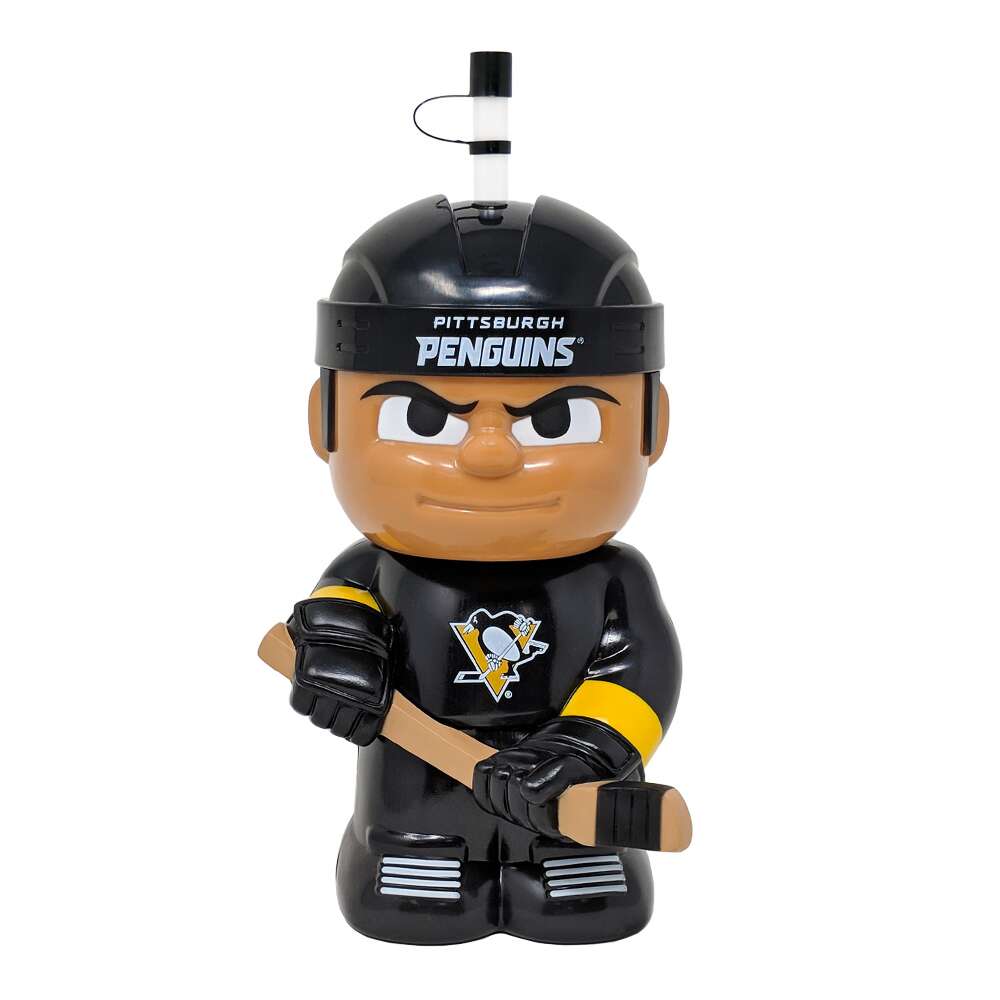 NHL Big Sip water bottles are shaped like hockey players! The Pittsburgh Penguins Big Sip holds 16oz of water, juice, soda, or any cold beverage. The top twists off so you can pour your favorite drink inside. Includes a reusable straw and stop cap. Fun for kids and hockey fans ages 4 and up!