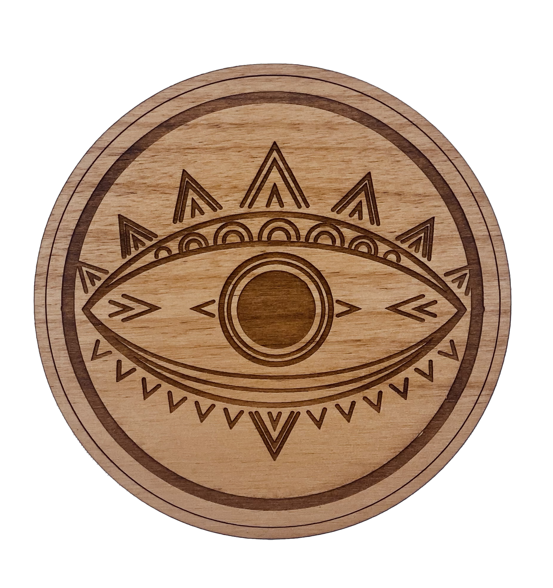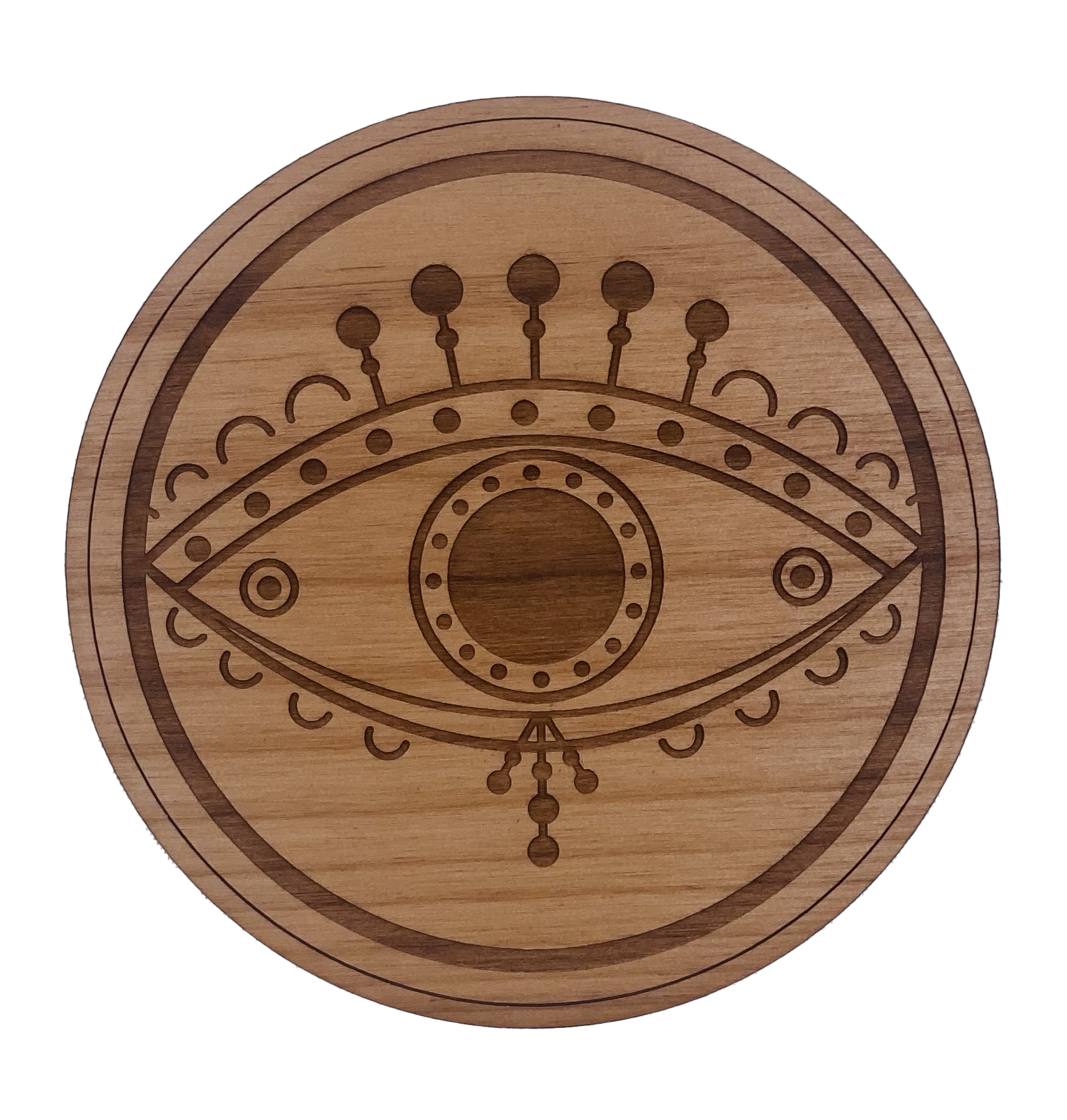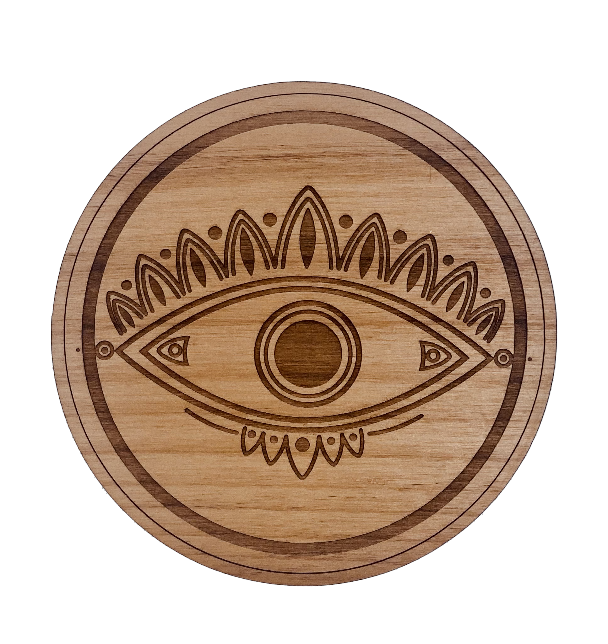 Evil eye 3 4" round alder wood coaster with cork feet.