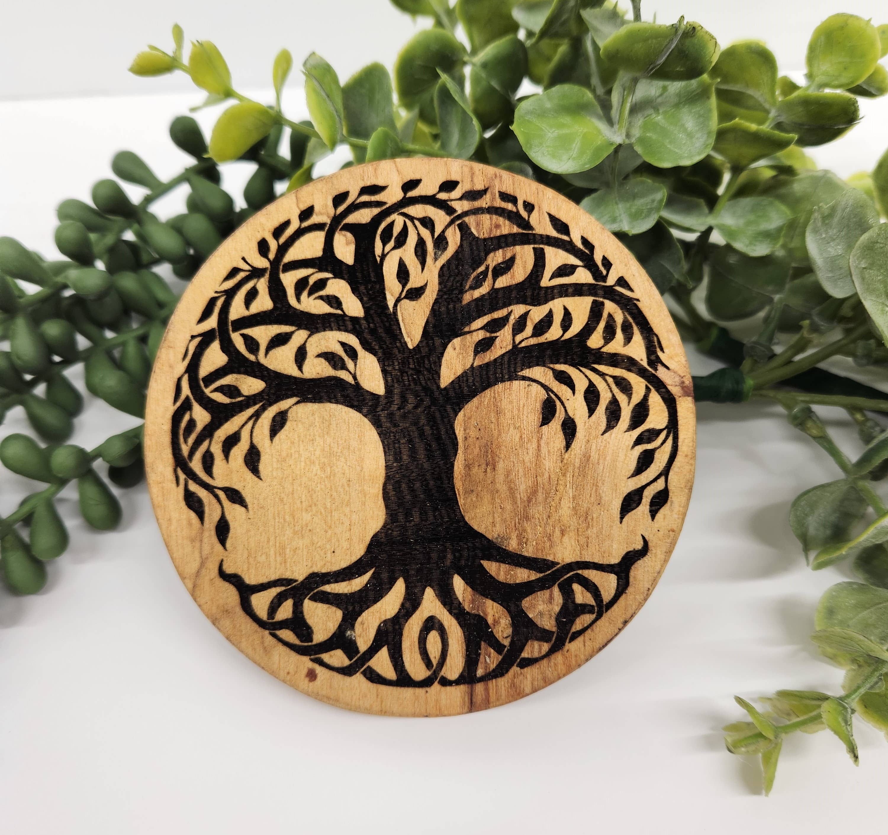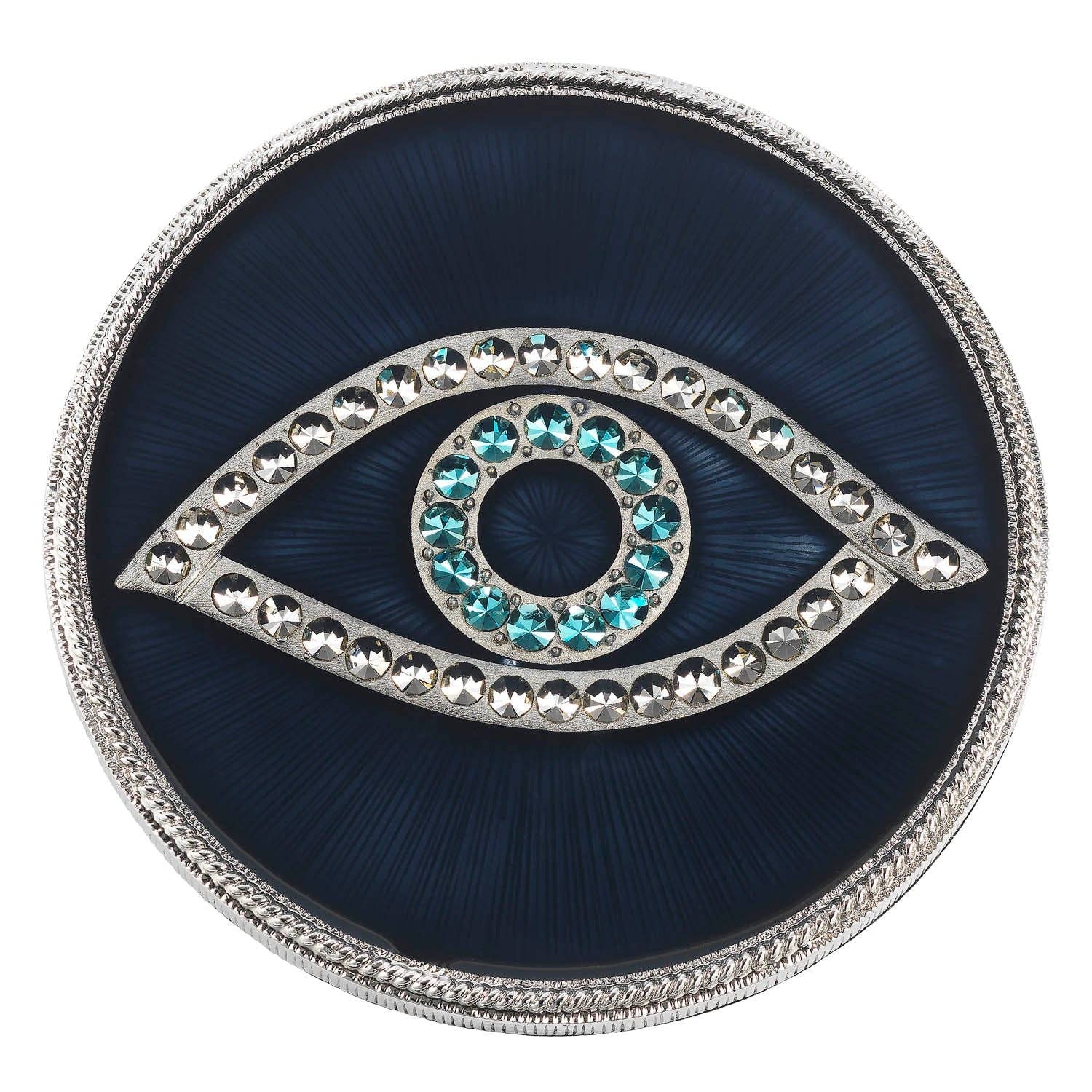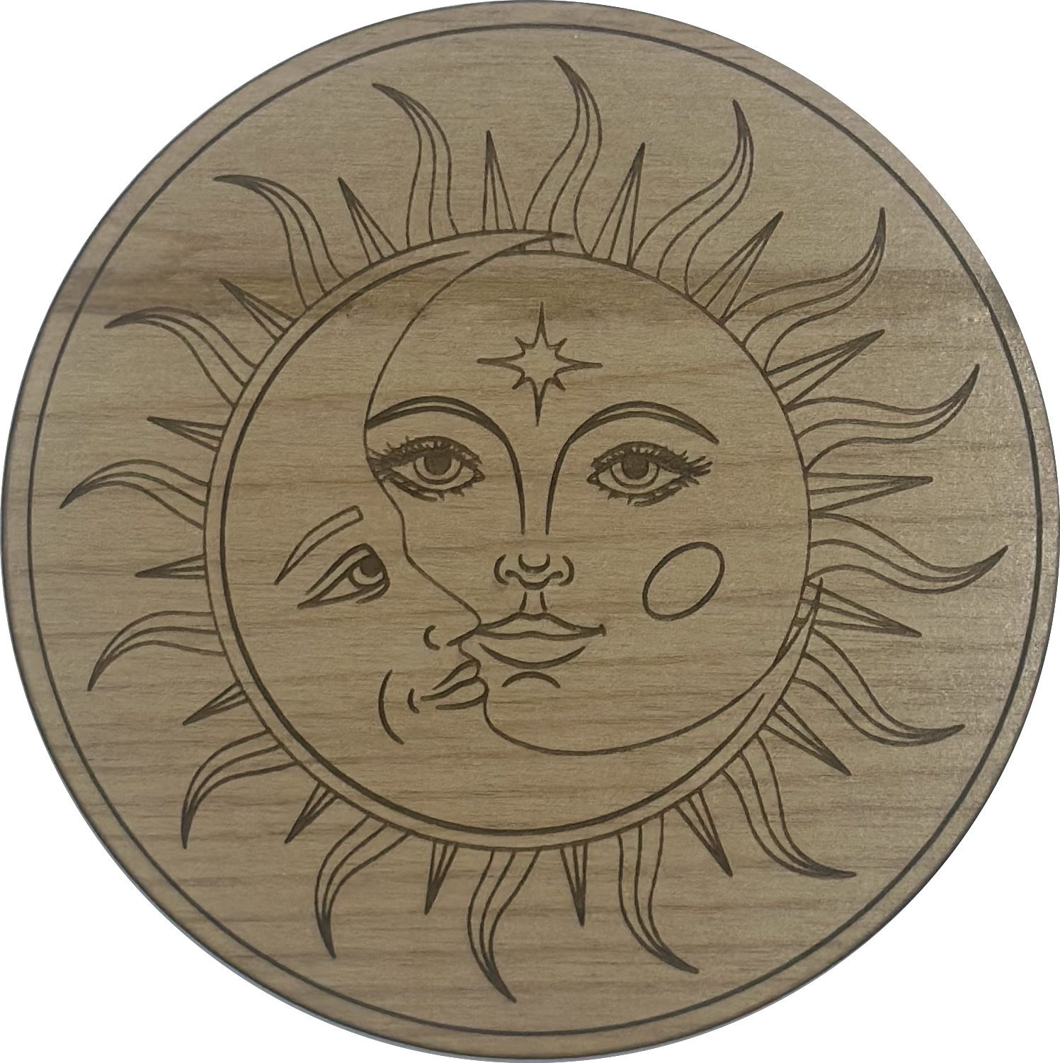 Evil eye 3 4" round alder wood coaster with cork feet.