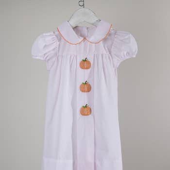 Celebrate the season in style with this charming Fall Thanksgiving & Halloween "GOBBLE" Smock Embroidery Baby Girl Dress. Crafted for comfort and festive flair, its delicate smock embroidery adds a sweet, seasonal touch perfect for holiday gatherings. Soft, breathable fabric ensures your little one stays cozy while looking adorable. Make every moment memorable with this delightful dress designed to capture the spirit of fall celebrations. SKU:DRG53235 body:97% Cotton 3%Spandex combo:100%Cotton