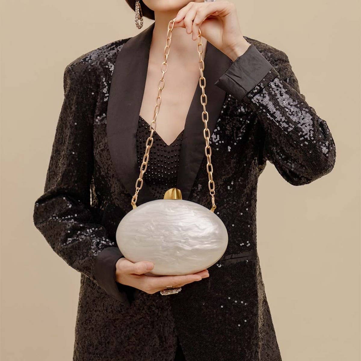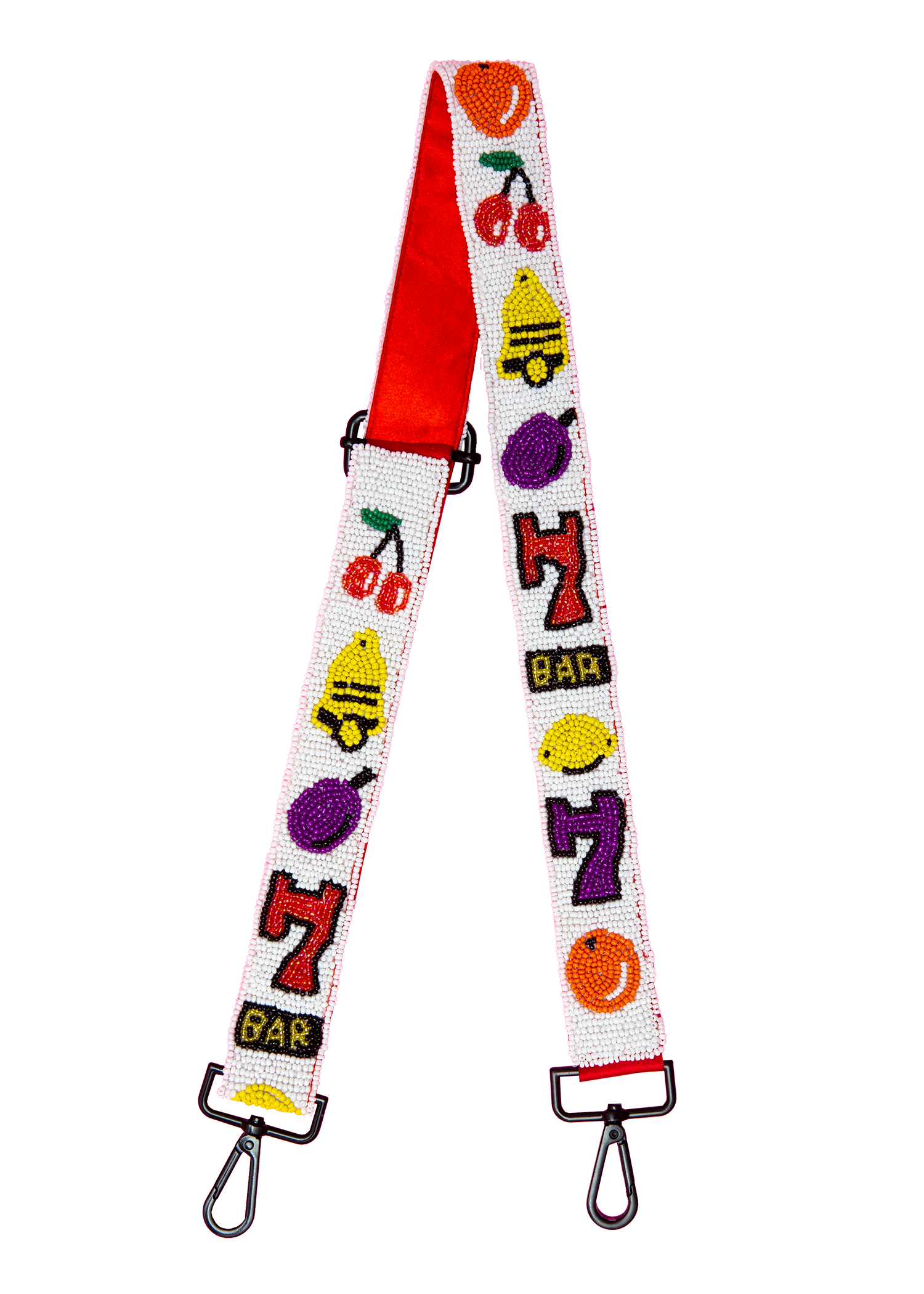 our best-selling bag from 2019 is back for it's third rodeo! this 100% beaded 8 ball bag features 2 metal D-rings that flip in for use as a clutch or allow the wearer to attach a strap of their choice. a black metal chain purse strap is included with each purse. the magnetic closure allows for hassle-free use, and a red satin lining keeps things interesting! bag body measures approximately 9" x 9" to accommodate a smart phone (amongst other things...)
