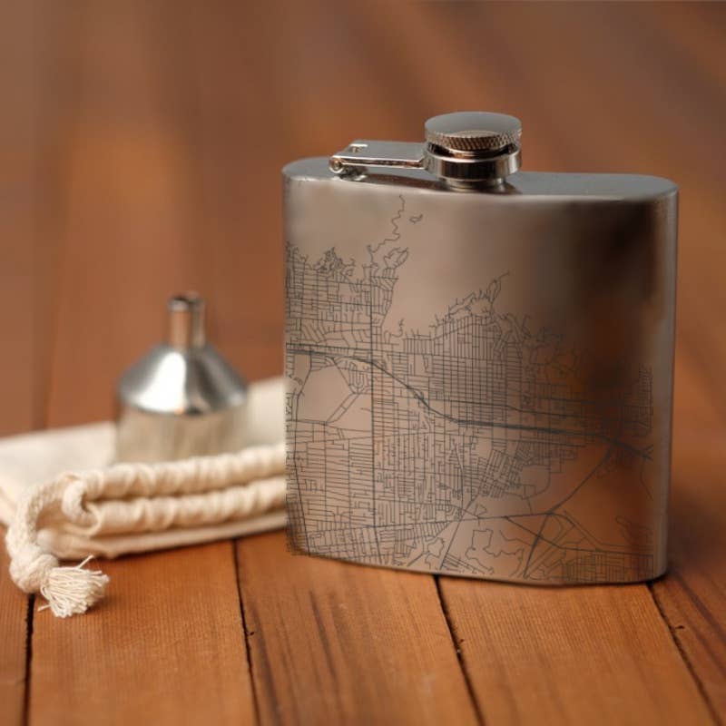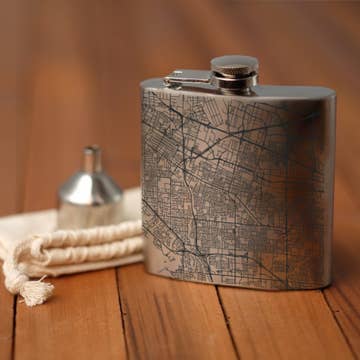 Our Stainless steel flasks are wrapped in vegetable tanned leather from Wickett & Craig in Curwensville, Pennsylvania. We hand carve or laser etch each dye cut flask, and treat them with penetrating oil dye and water resistant sealer before stitching them with artificial sinew, we then cement the leather to the flask for maximum durability. This Light brown flask measures 4" wide by 4 1/2" tall, and holds 6 oz. Etched with 1878 map of Paris, France.