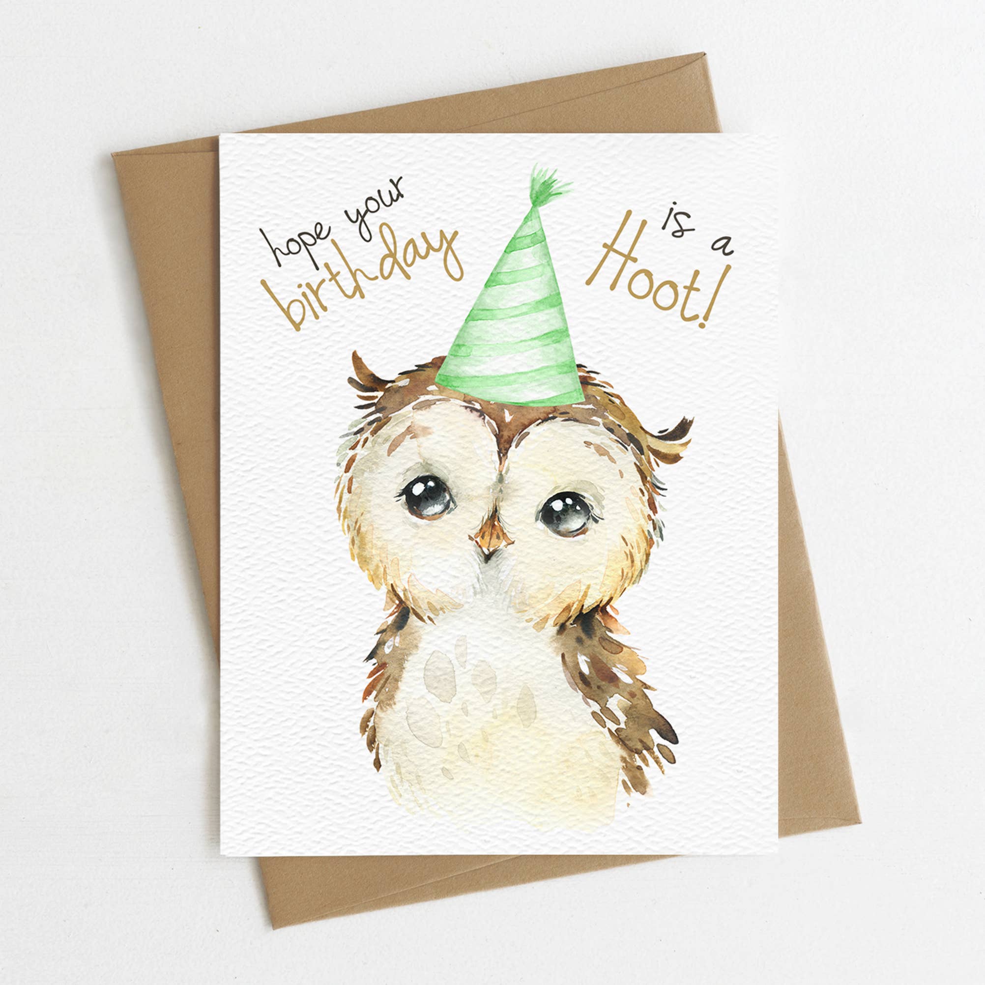 This birthday card features an original Snowy Owl illustration on a woody textured teal background with the text "Happy Birthday". A sweet card for animal lovers of all ages. • A2 card measures 4.25 x 5.5 inches (10 x 14 cm). • Printed in the USA on FSC certified 100% recycled paper. • Packaged in a compostable clear sleeve; can also go sleeveless. • Interior blank. • Envelope color may vary from photo. • Occasions: Birthday. • GC-091 • © Klinger Creative