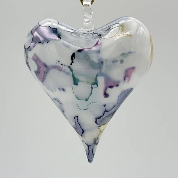 Say 'I love you' with this stunning hand blown glass heart ornament. It will add elegance & romance to any space. The perfect gift for a wedding, anniversary or Valentine's Day, or just to let your loved ones know that you are thinking of them. Crafted by skilled glass blowers in the heart of old Cairo, Egypt. The art of glass blowing began in Egypt at least in the 3rd Century A.D. Based on a poem written on papyrus that describes the technique. - Fair trade - Decorated by hand. - Borosilicate glass - Approx. H 9 cm x W 8 cm x D 3.5 cm / H 3.5" X W 3.2" X D 1.4" - Due to the technique of coloring this heart from the inside to create a marble effect, the hole on its back is larger than the hole on our o - Due to the nature of hand-blown glass, size & shape may vary slightly from one piece to another - Ethically handcrafted in Egypt